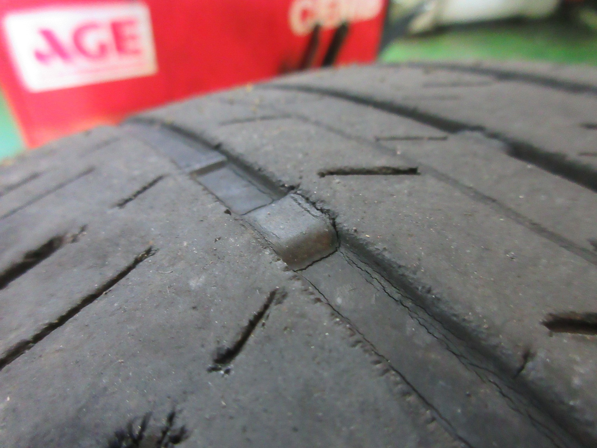 摩耗限度サインの「スリップサイン」が、ほぼ露出してると言っていい状況になるまで摩耗しています。