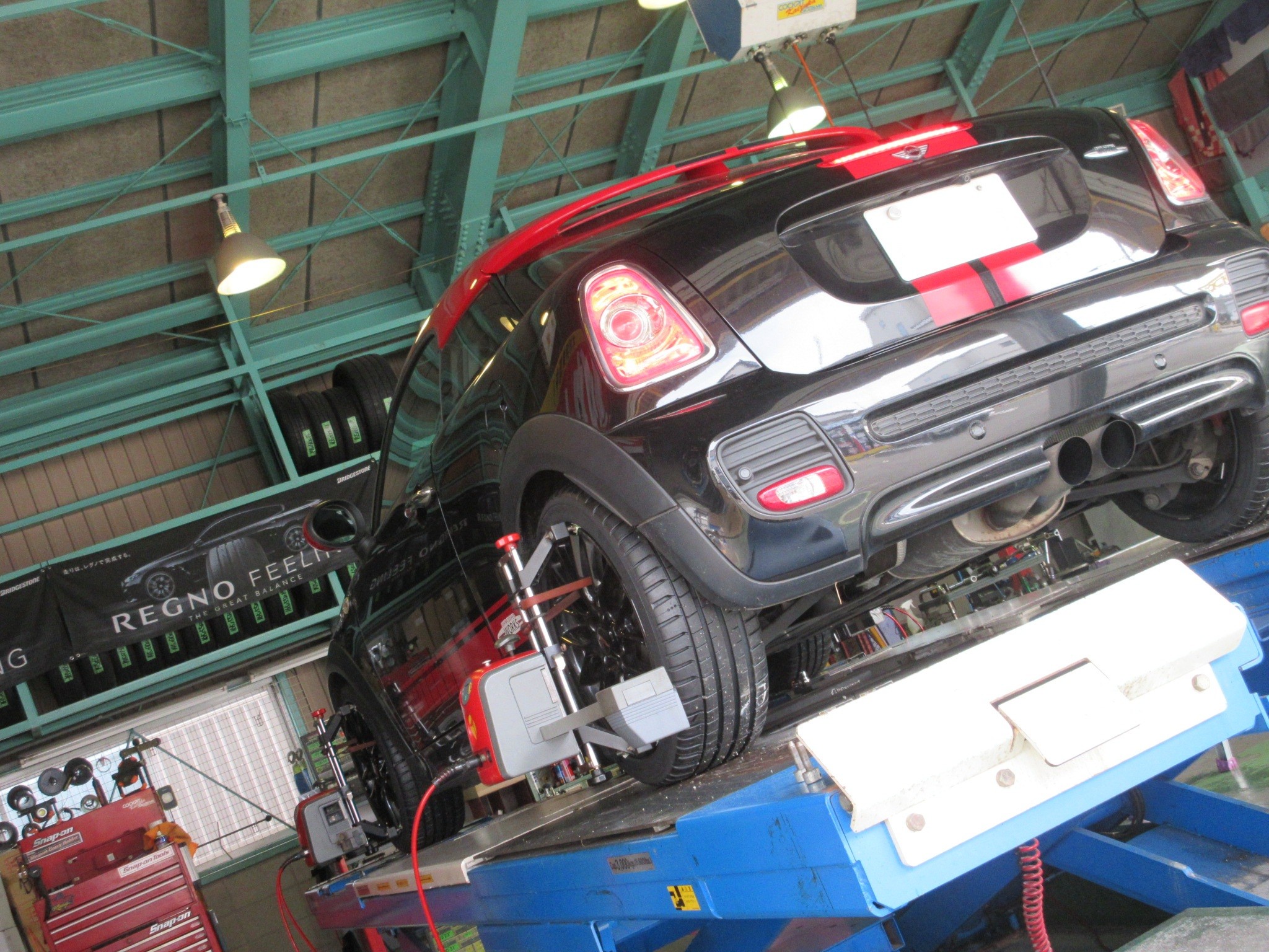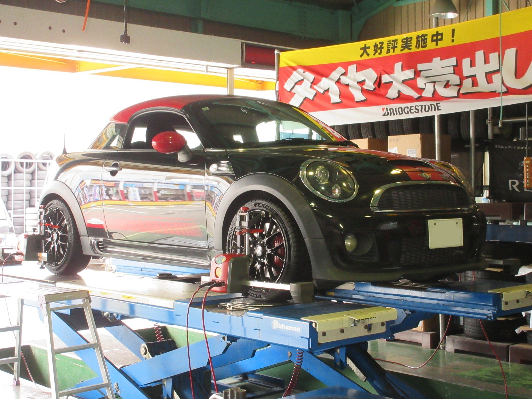 R58 MINI JCW(JOHN COOPER WORKS)クーペのアライメント調整です。