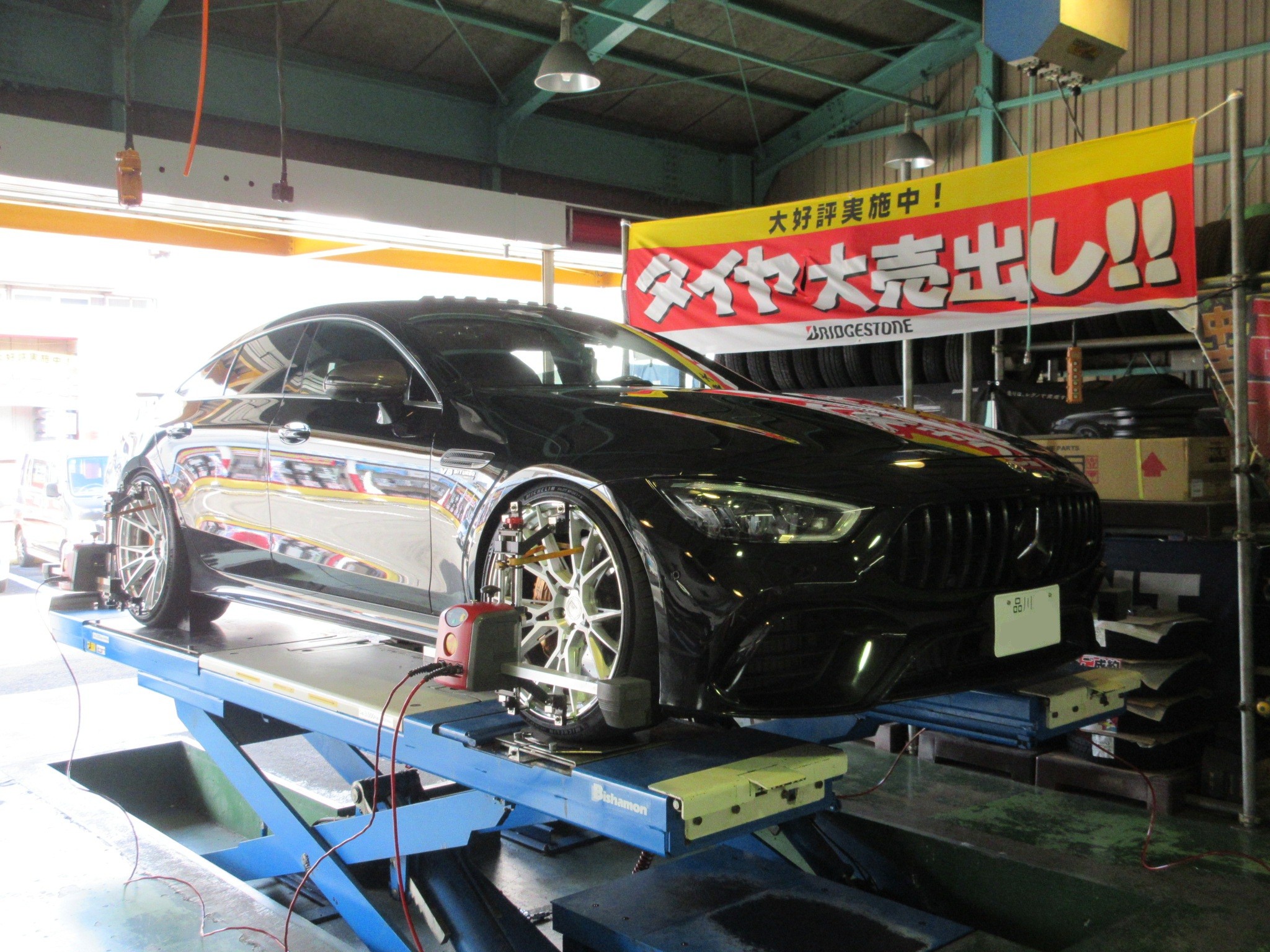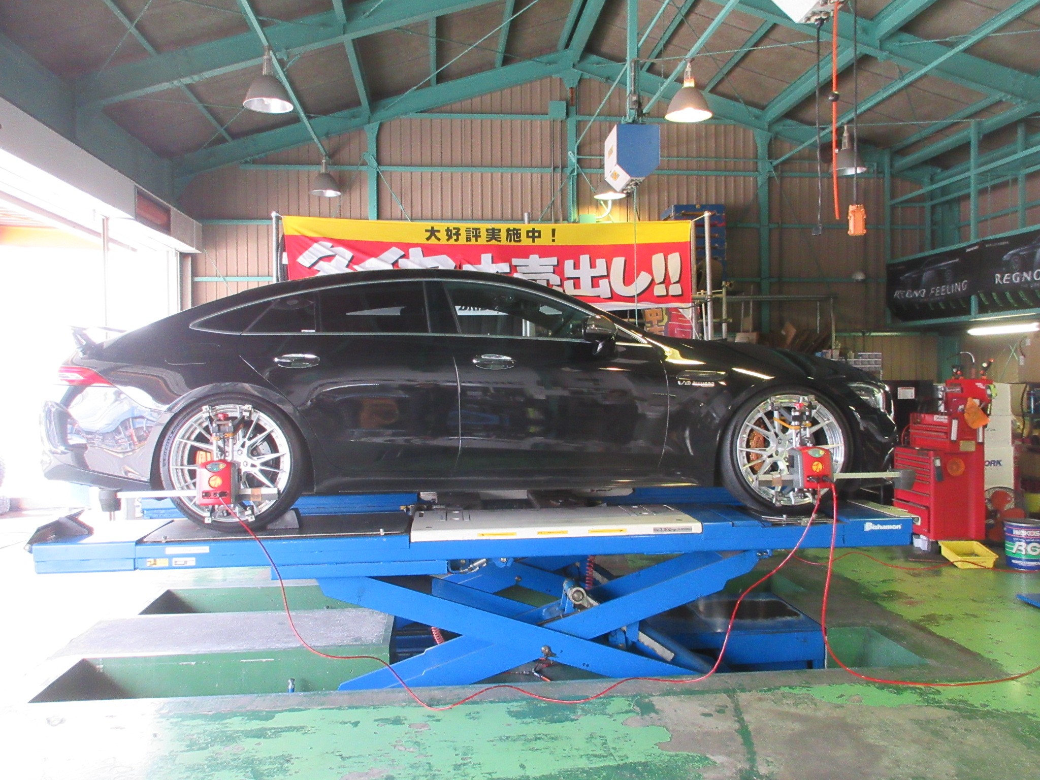 遠路はるばる東京から御来店頂きましたAMG GT63Sのアライメント調整作業です。
