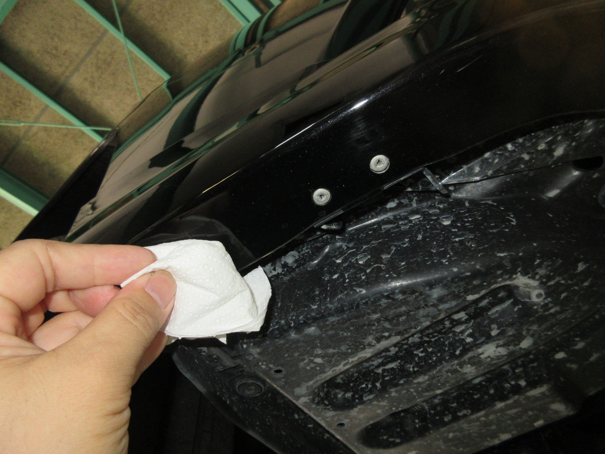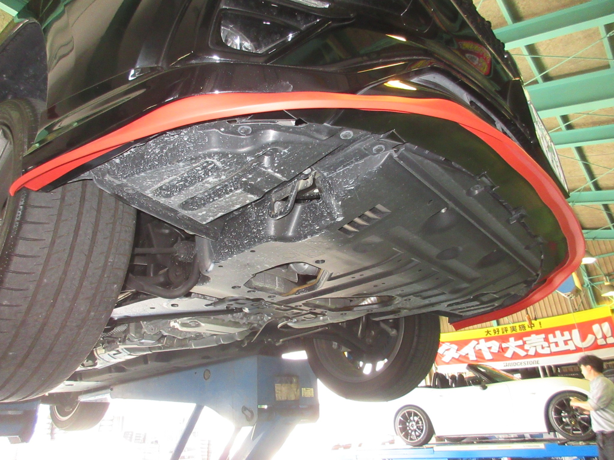 まずは作業し易い位置まで車両を上げて、貼付け面を清掃です。