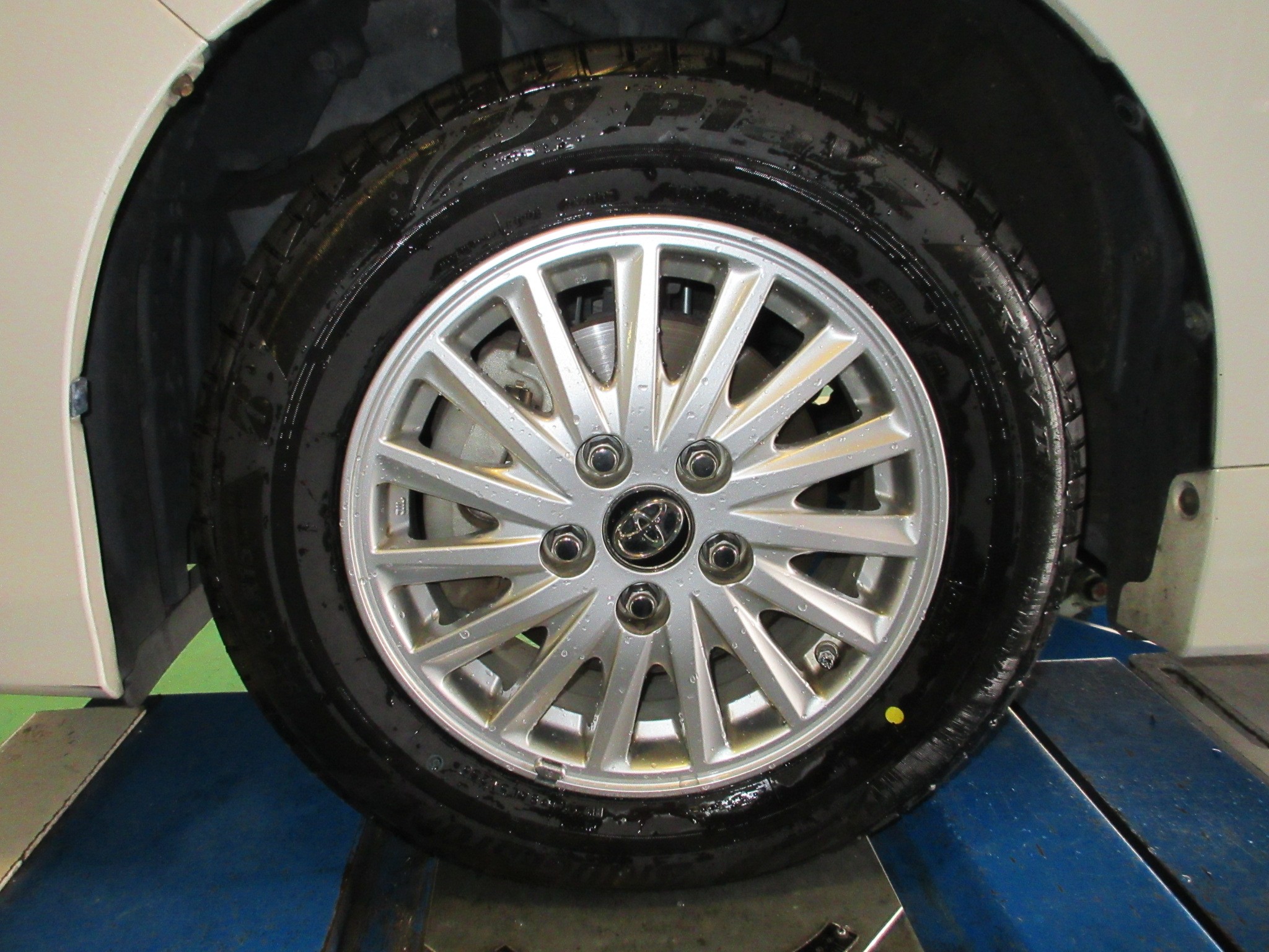タイヤ交換だけならそこまでの作業でOKというところですが、今回は健康診断的な意味合いで、アライメント調整も行います。