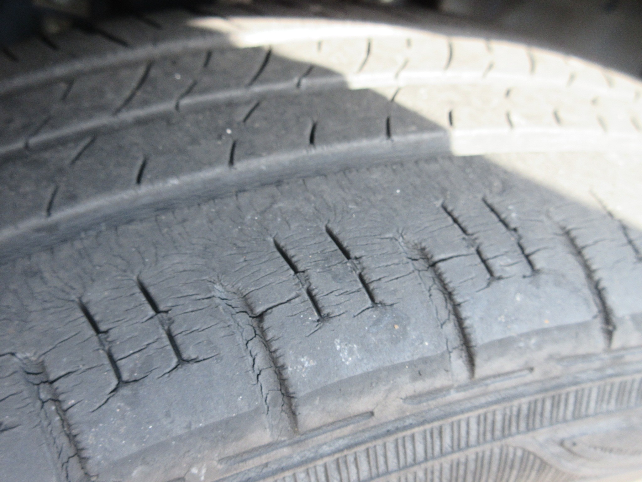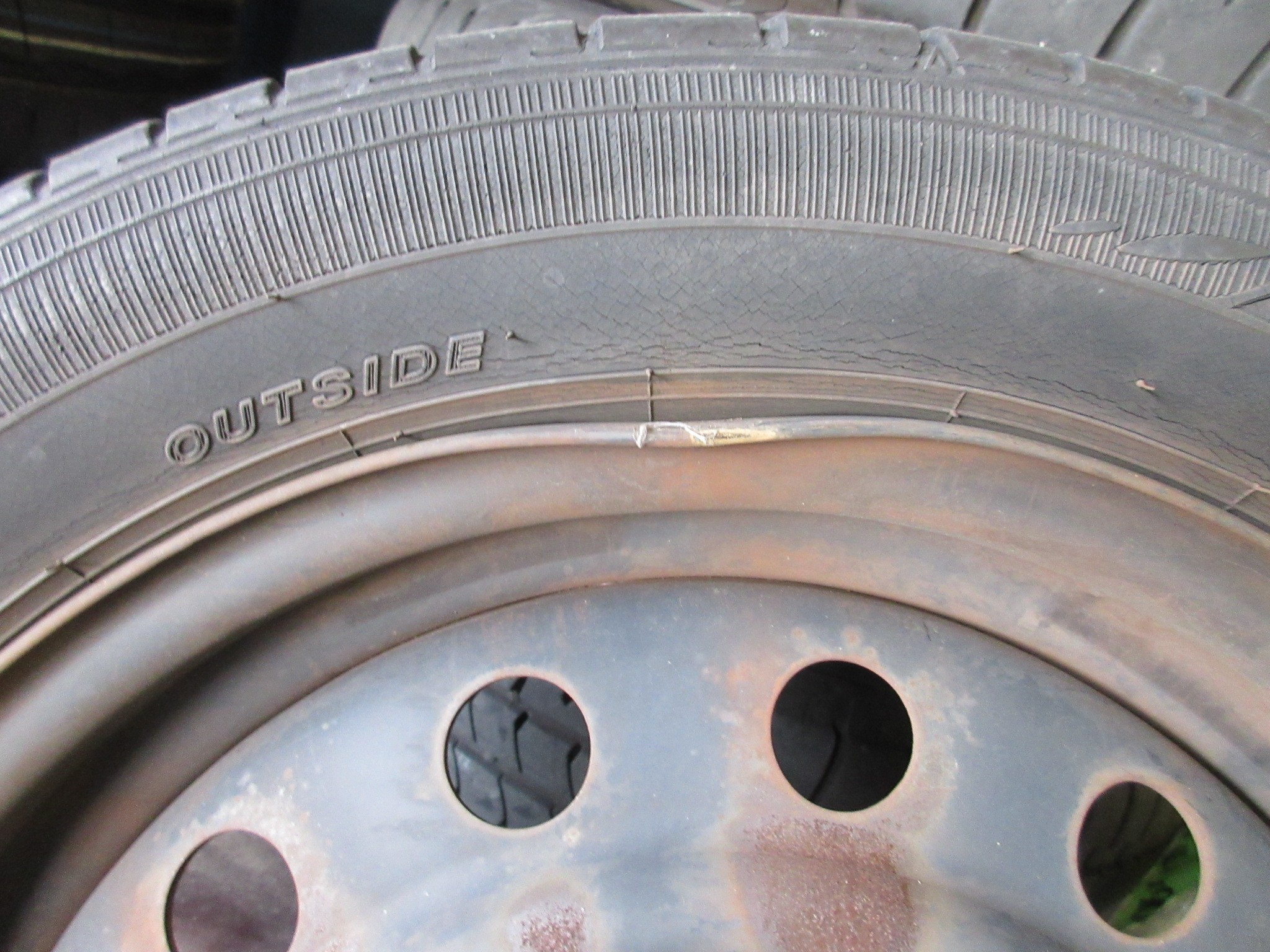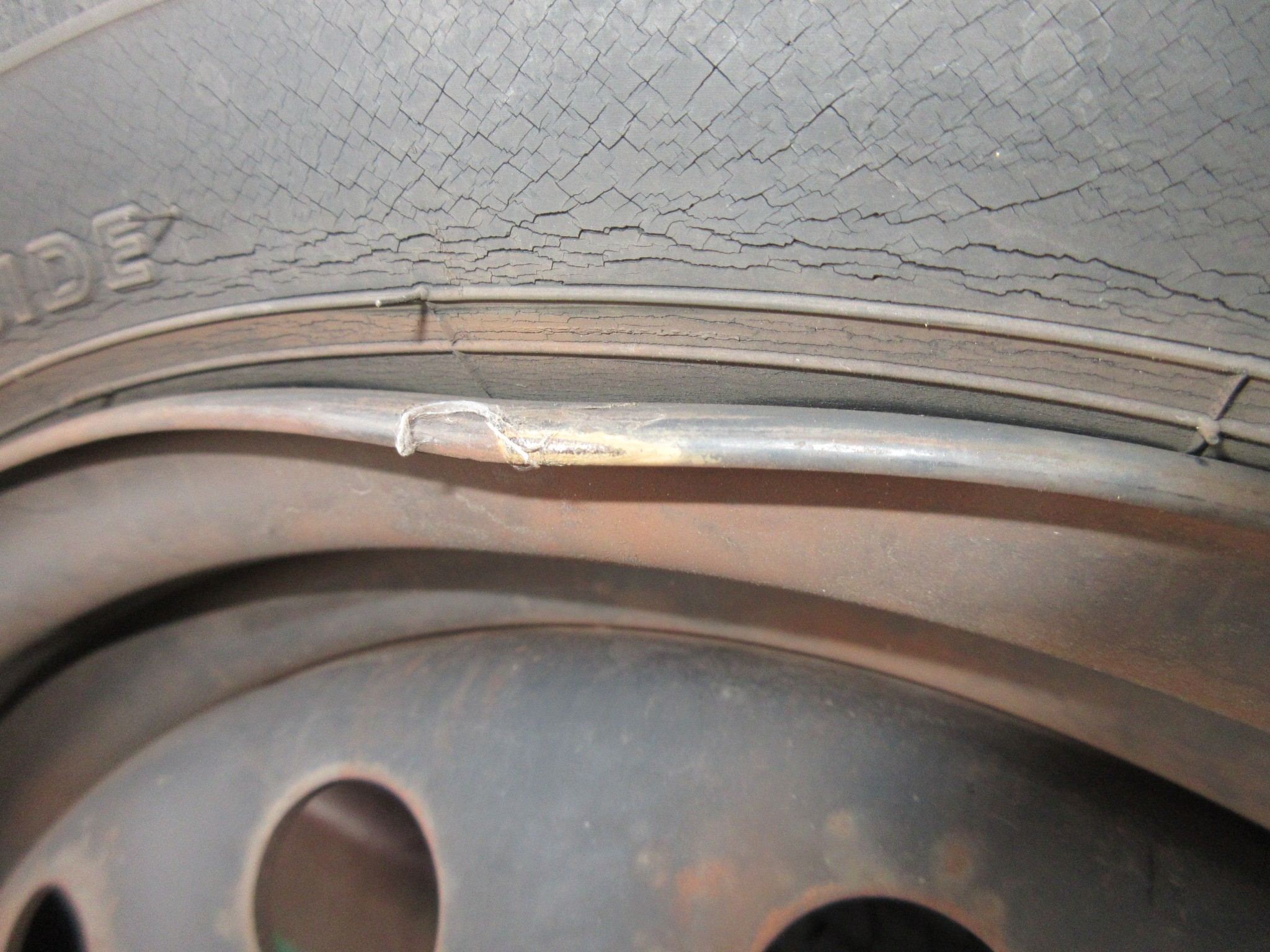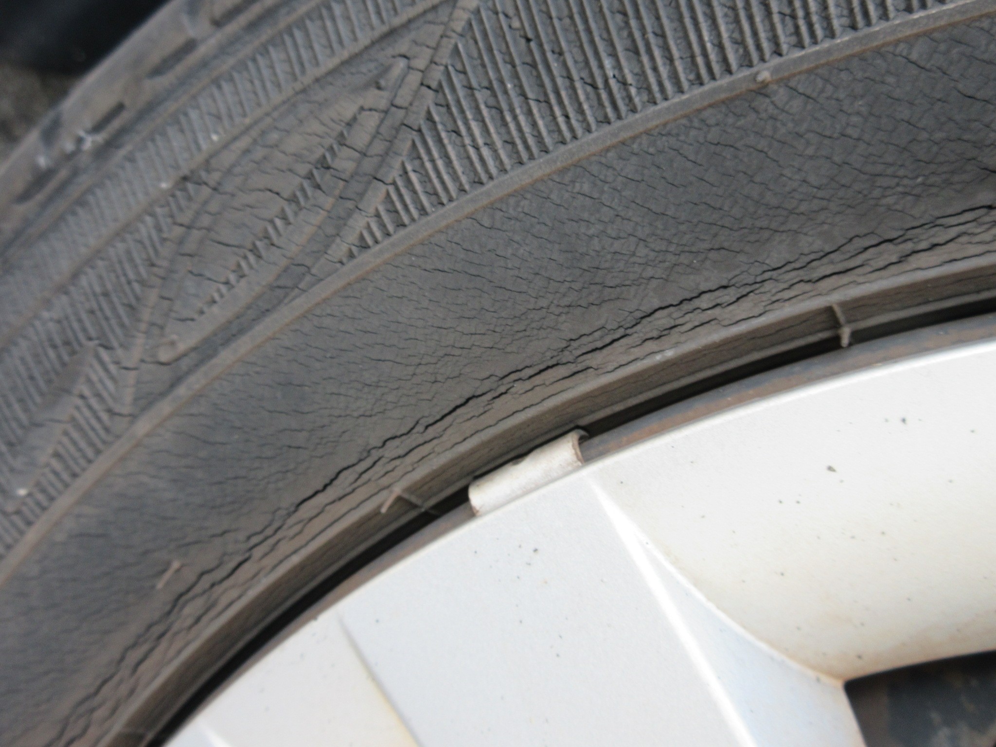で、タイヤの状態はこんな状況で、タイヤサイド部には細かいヒビが多数発生し、ホイールリムに近い部分は少し大きめのヒビに進行しています。