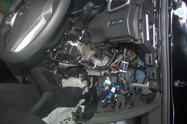 取付けは車輛配線を加工して取付けをしますが、当店ではハンダを使った確実取付けを行なうとともに、配線も見えないところではありますが、極力目立たないように取付けしています。写真に写っている配線はもともと着いてたETCの配線です。