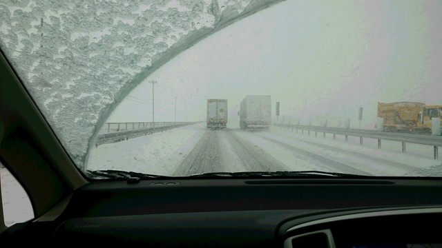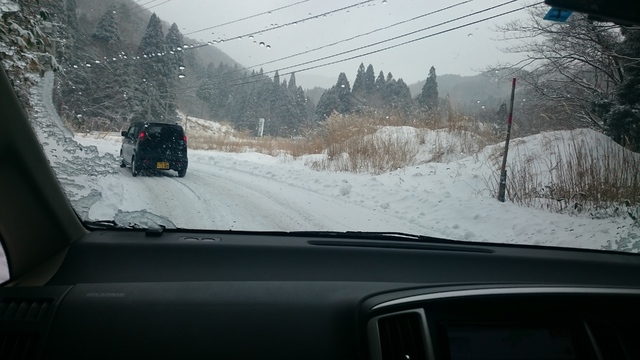 道路公団の黄色い車が除雪作業でスローダウン。突然の雪でスタッドレスタイヤを付けていないお車が、高速を降りようとしてインターも大渋滞。スキー場に着いたのは出発から5時間後の11時でした。