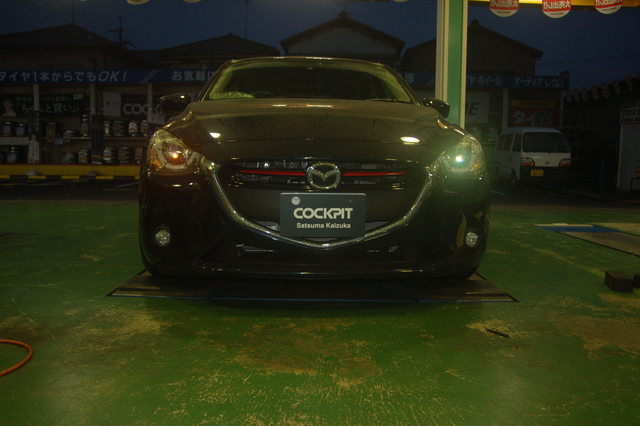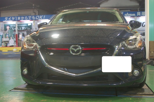 DJ型デミオ、フロントライセンスプレートオフセットステー取付けです。