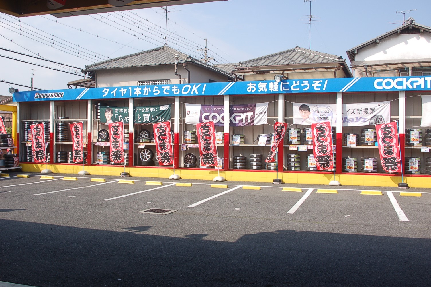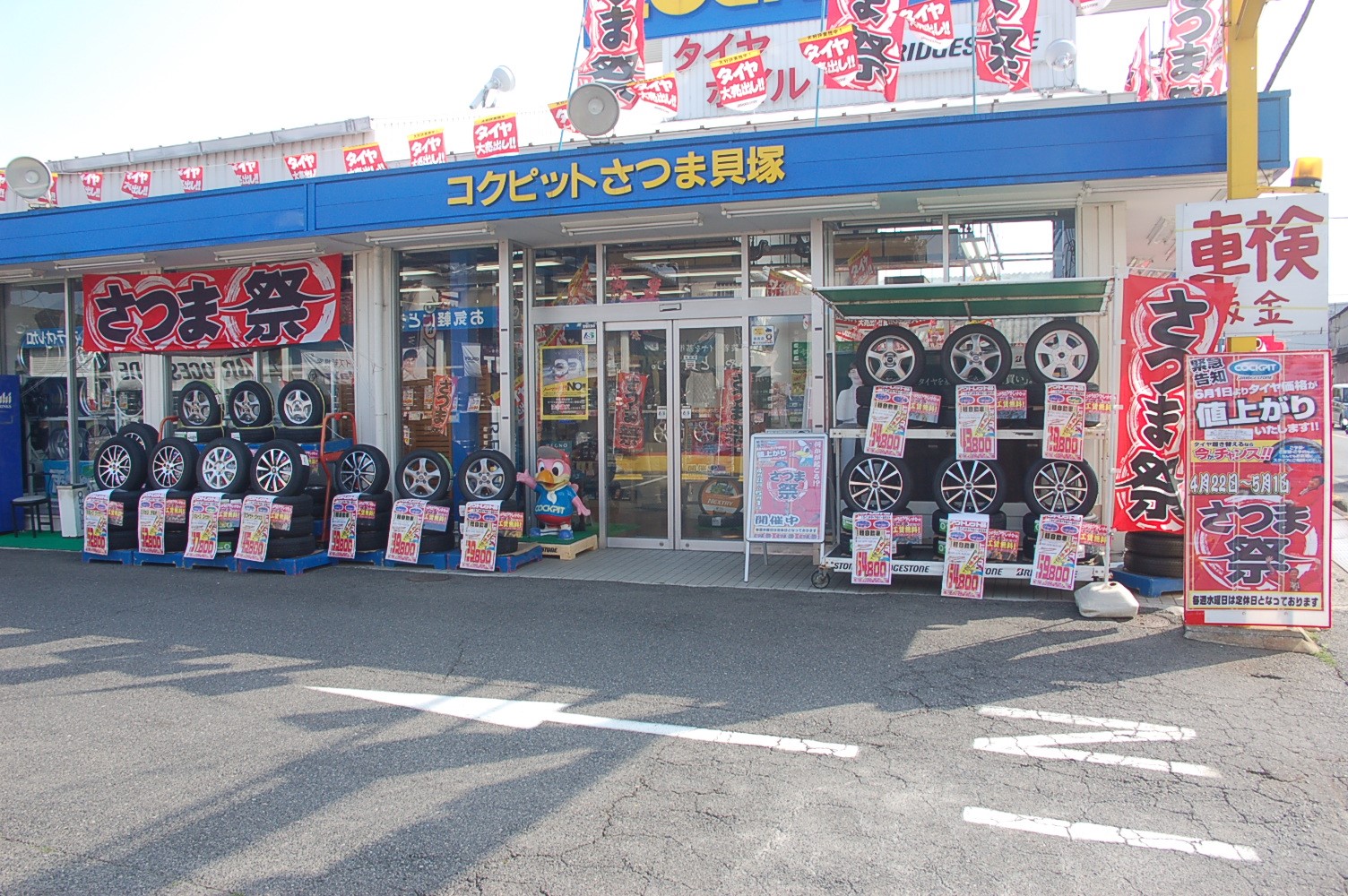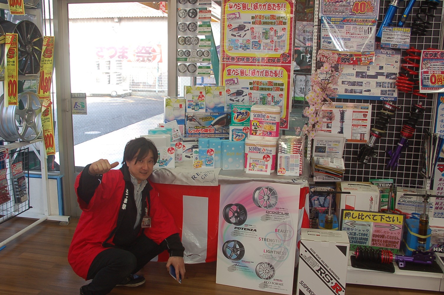 店舗入り口では、セールに合わせて展示ホイールの配置変更をしました。
