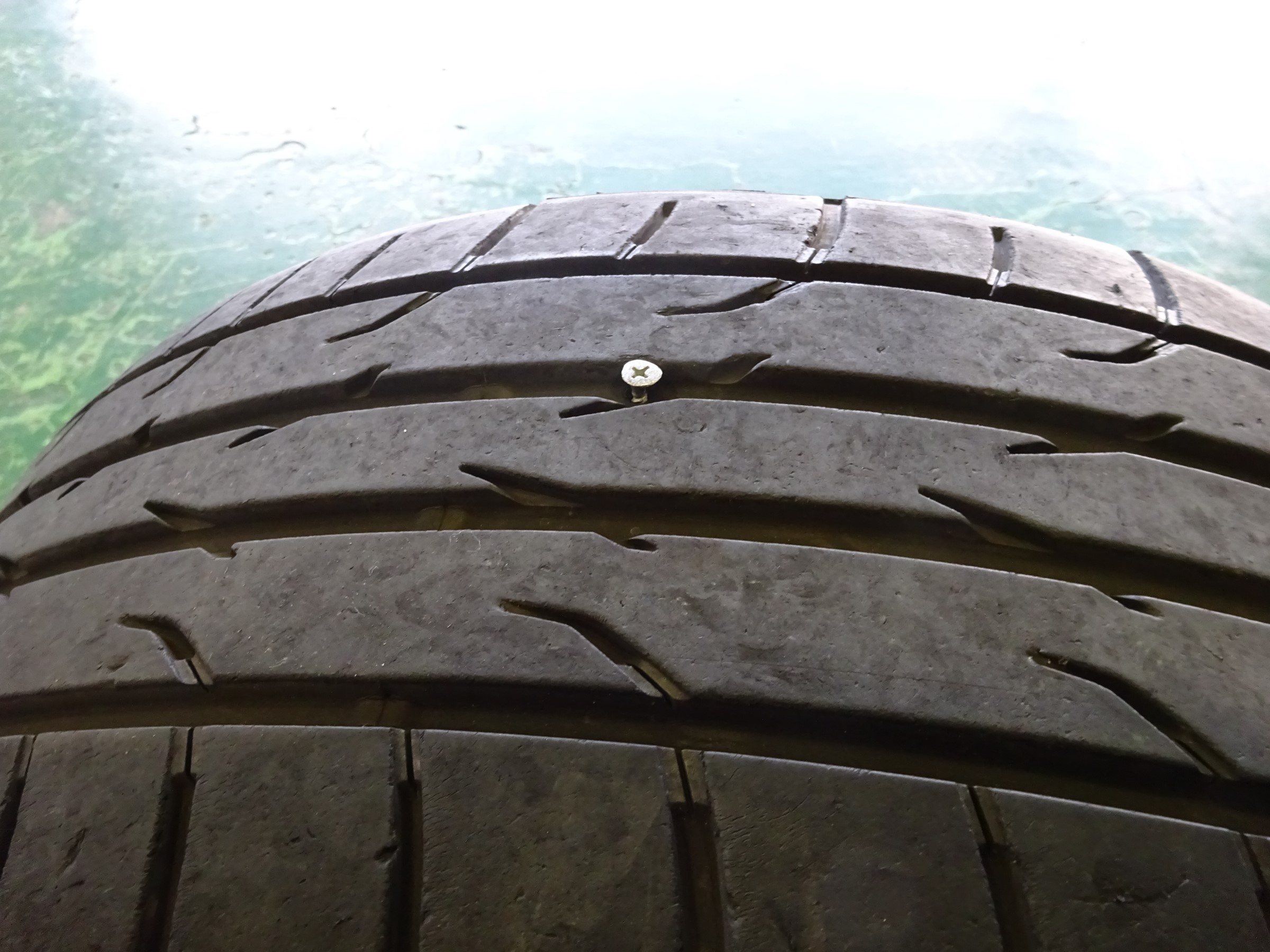 ビスが刺さり空気が抜けた状態で走行した結果タイヤが損傷したようです。