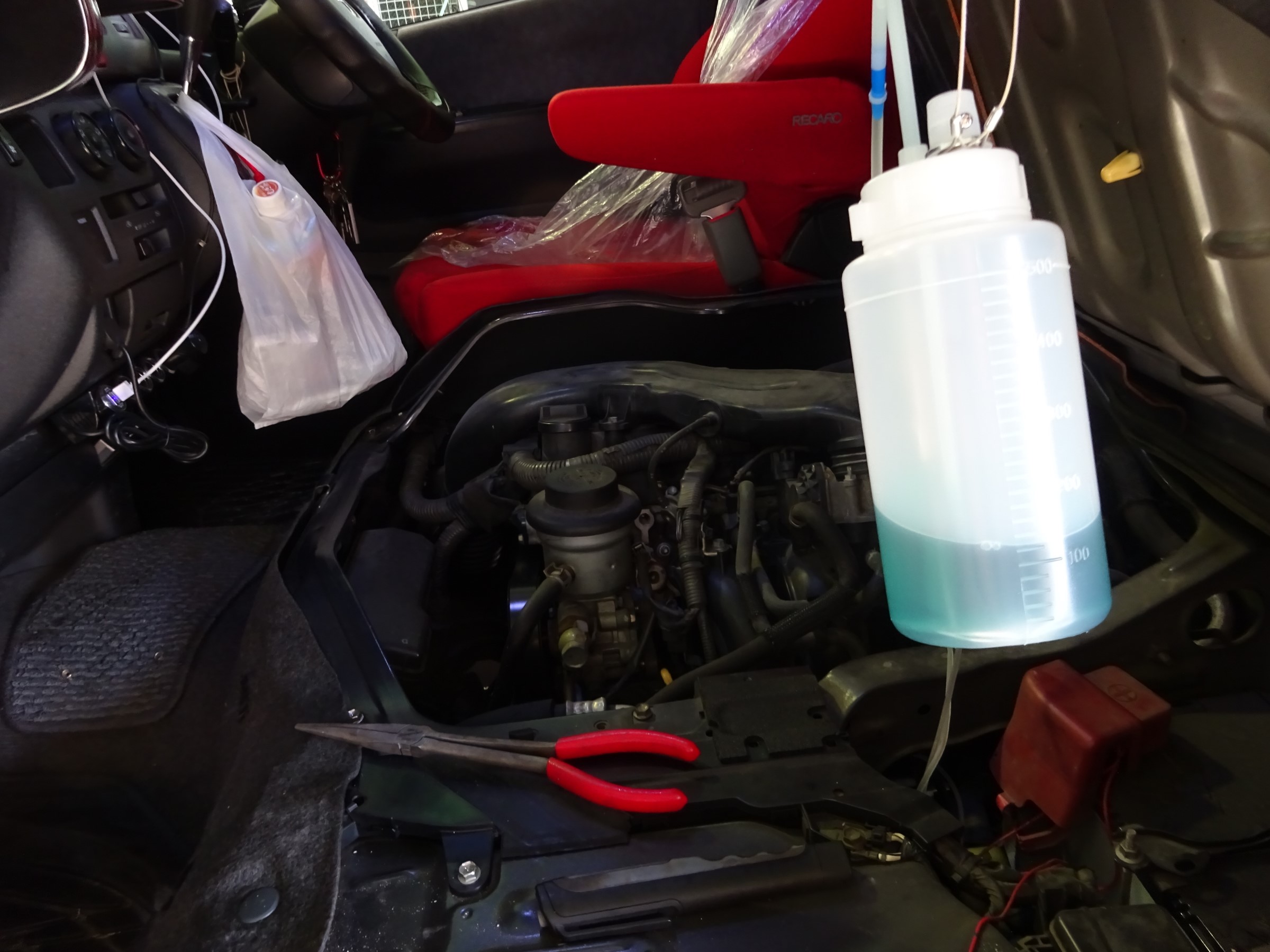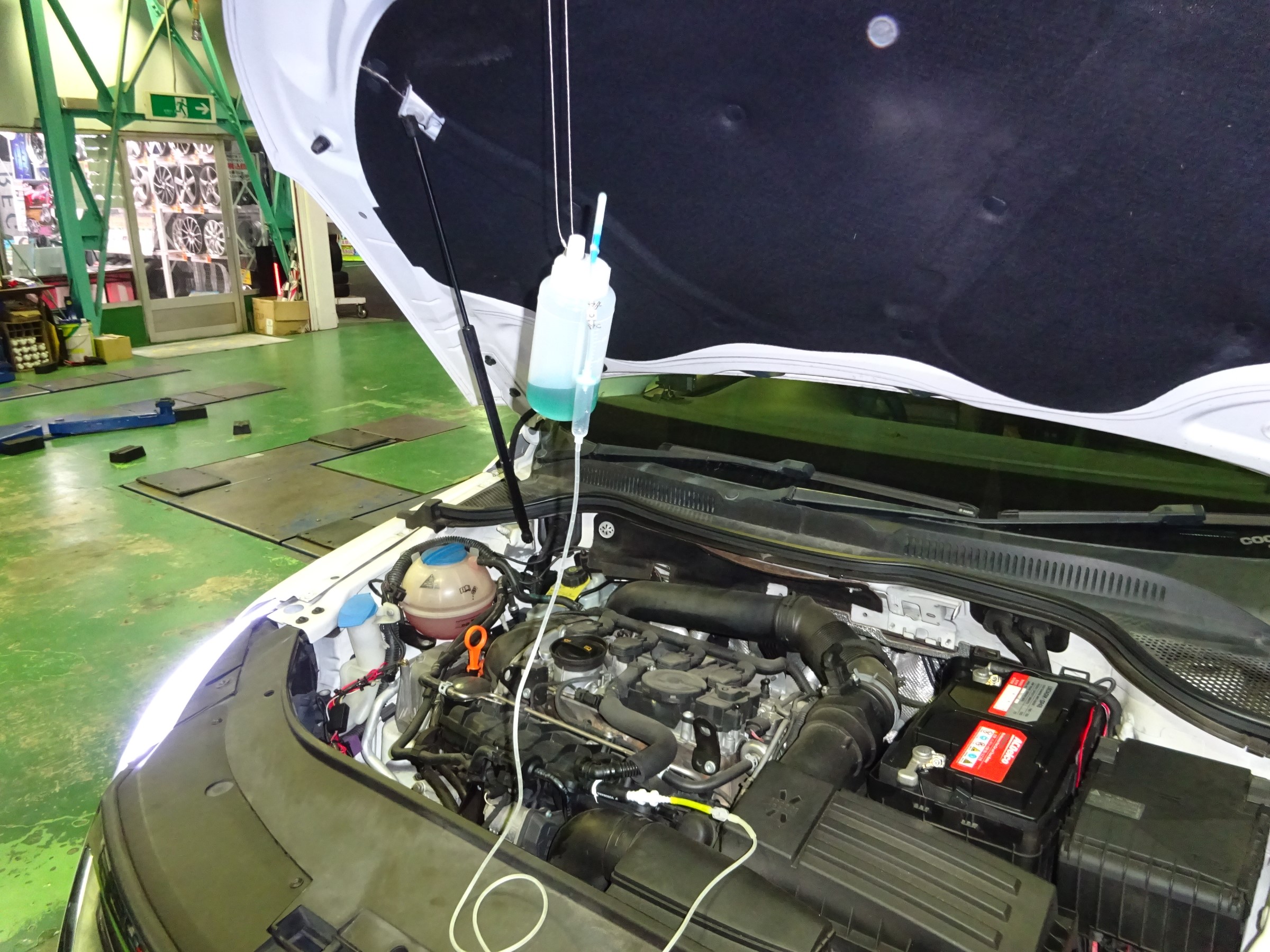 点滴の様な装置で少しずつ注入し、吸気バルブや燃焼室をしっかり洗浄していきます。