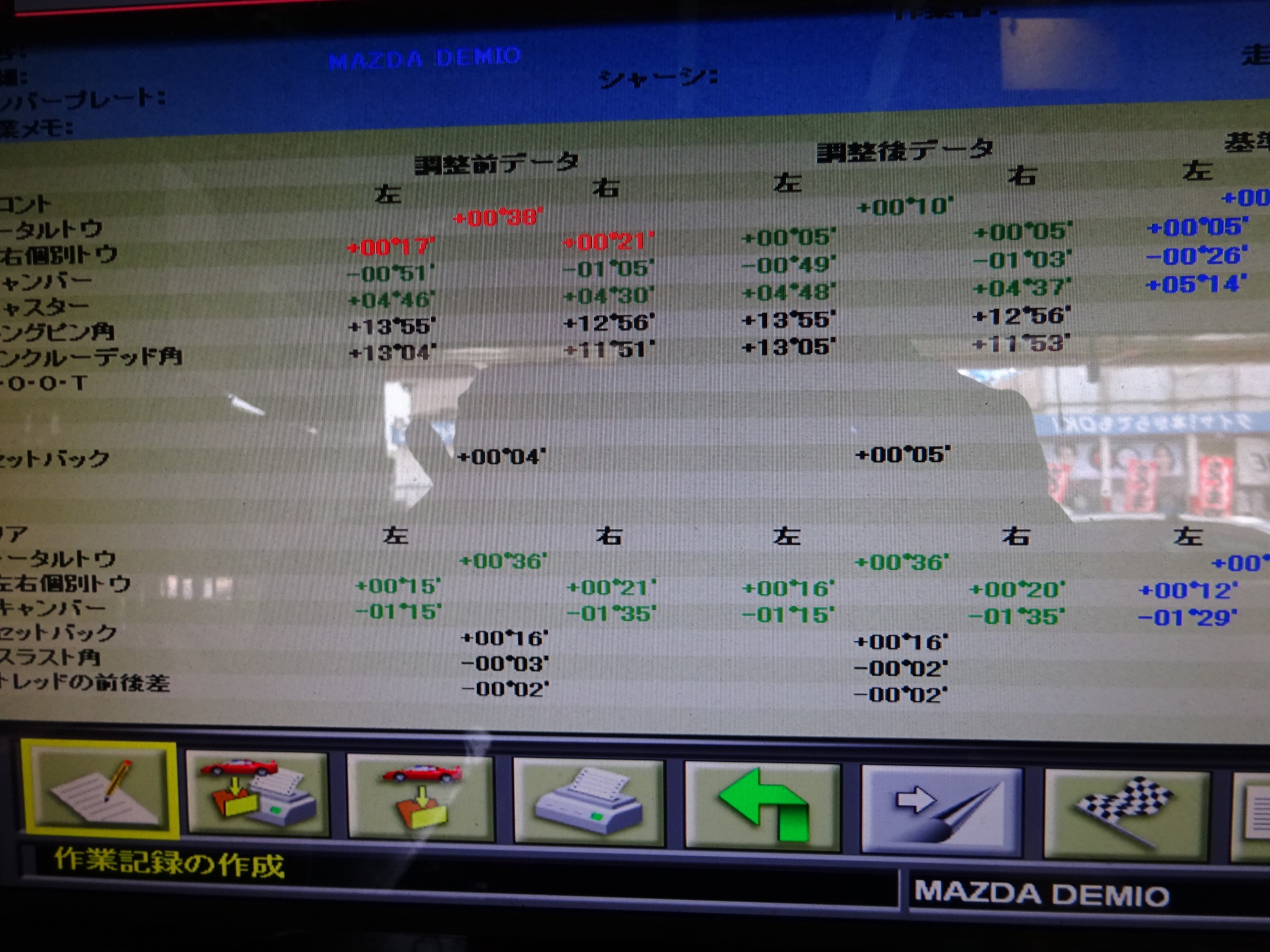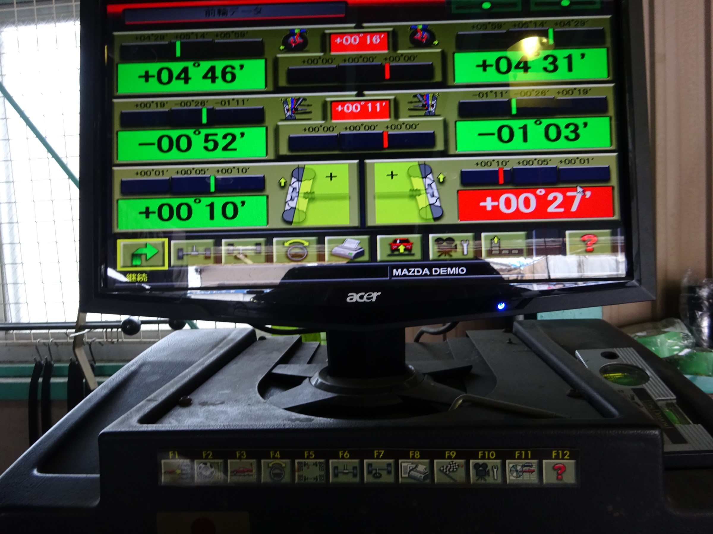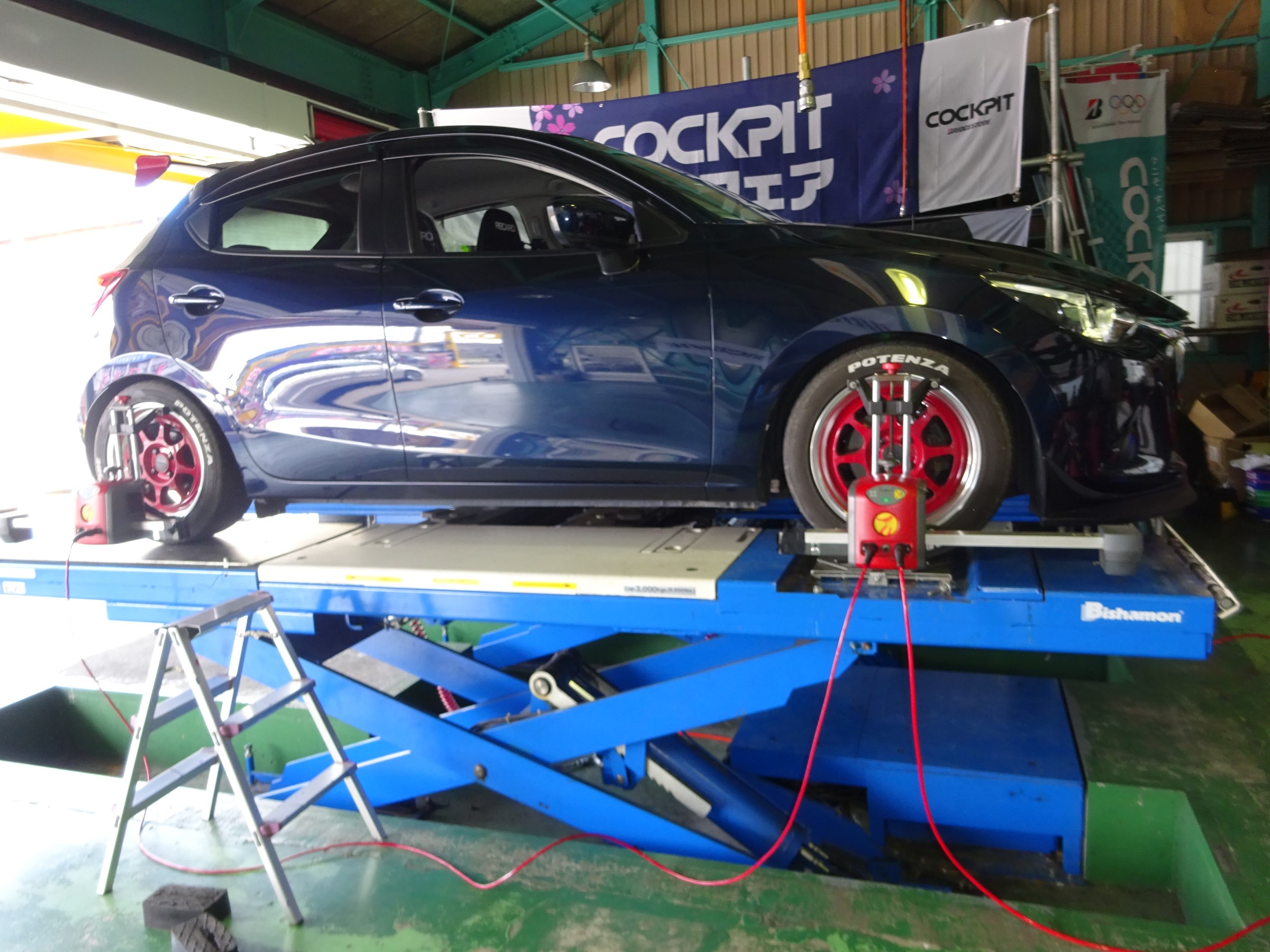 少し前にリップスポイラー取り付けと車高調整をしたデミオのアライメント作業です。