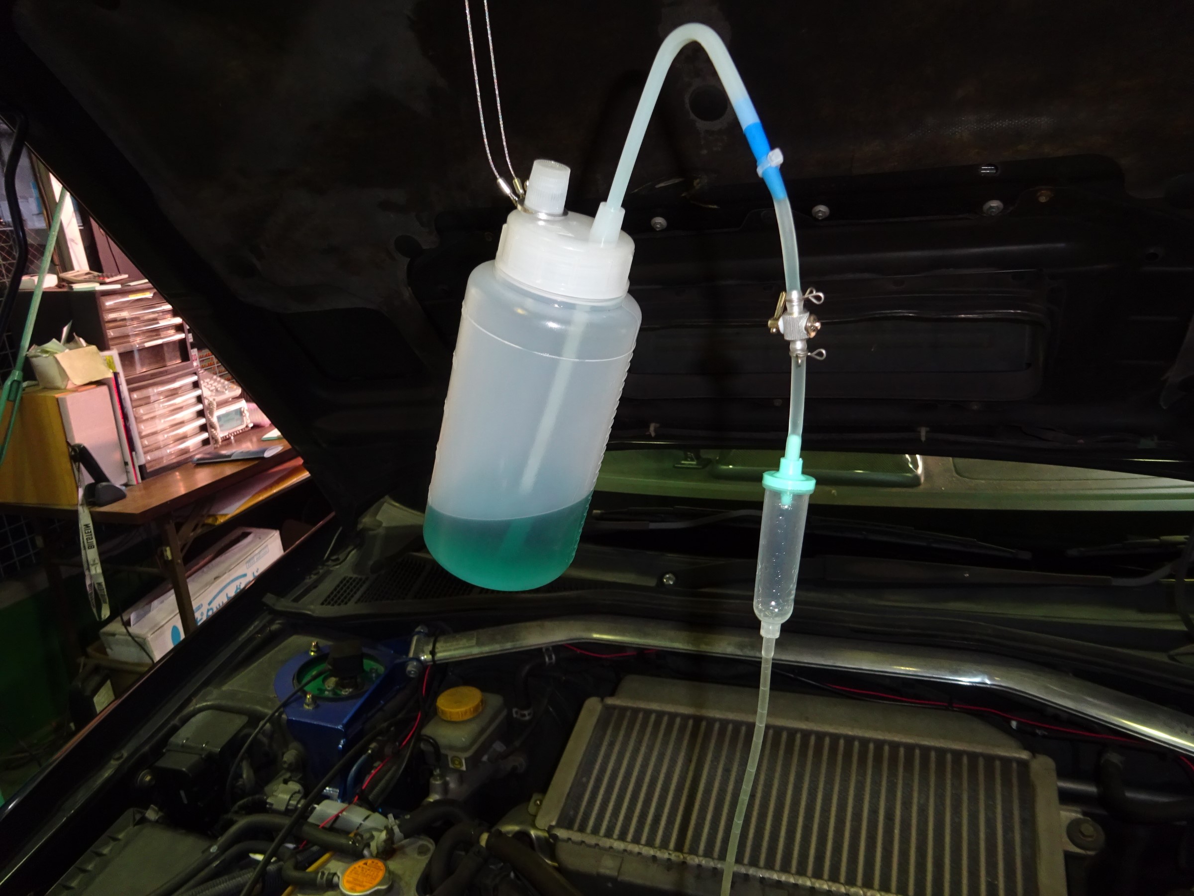そしたら点滴の様にポタポタ水滴が落ちるぐらいに吸入スピードを調整し、液が空になるまでエンジンを掛けっ放しでしばらく待ちます。