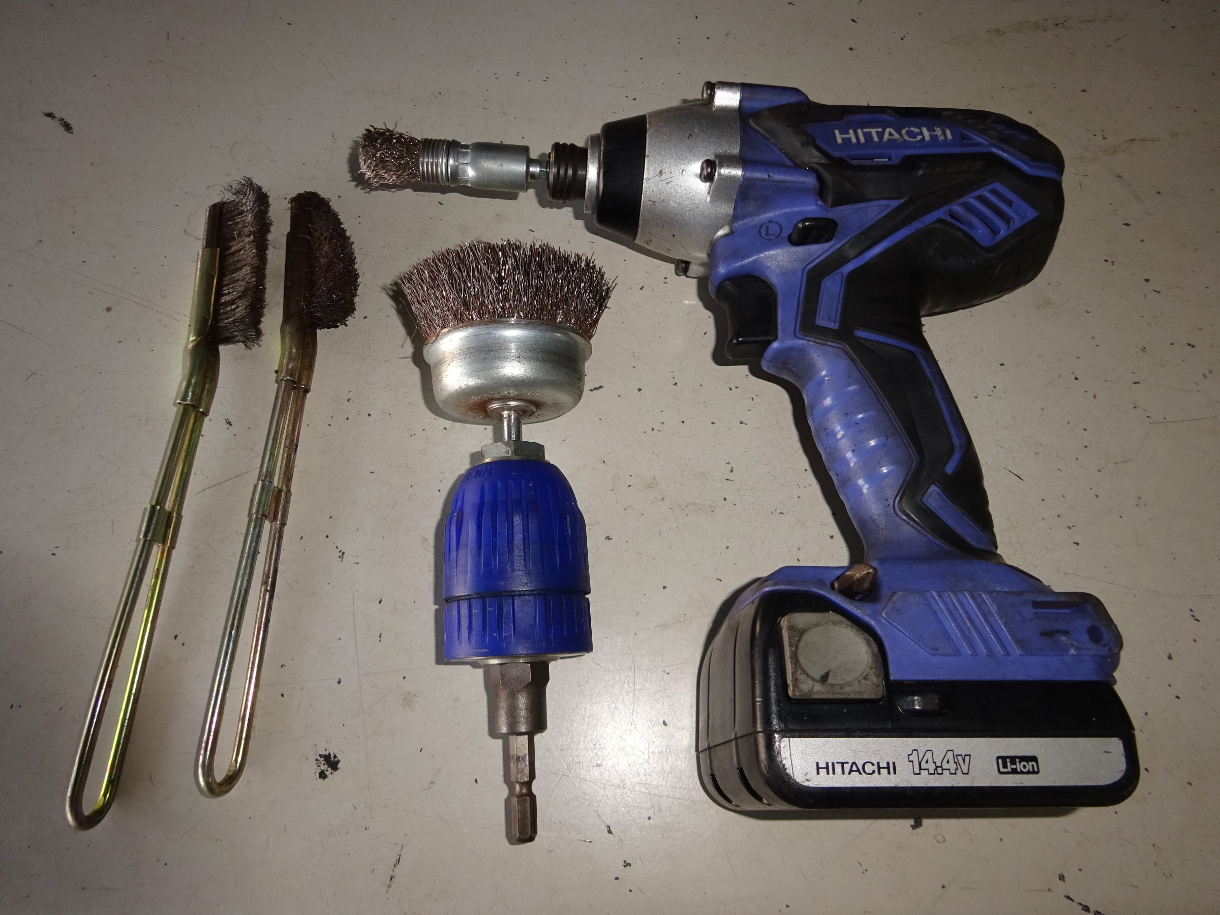 そんな場合はこの様なブラシを駆使して、徹底的に錆びを落としてから防錆剤を塗り込みます。