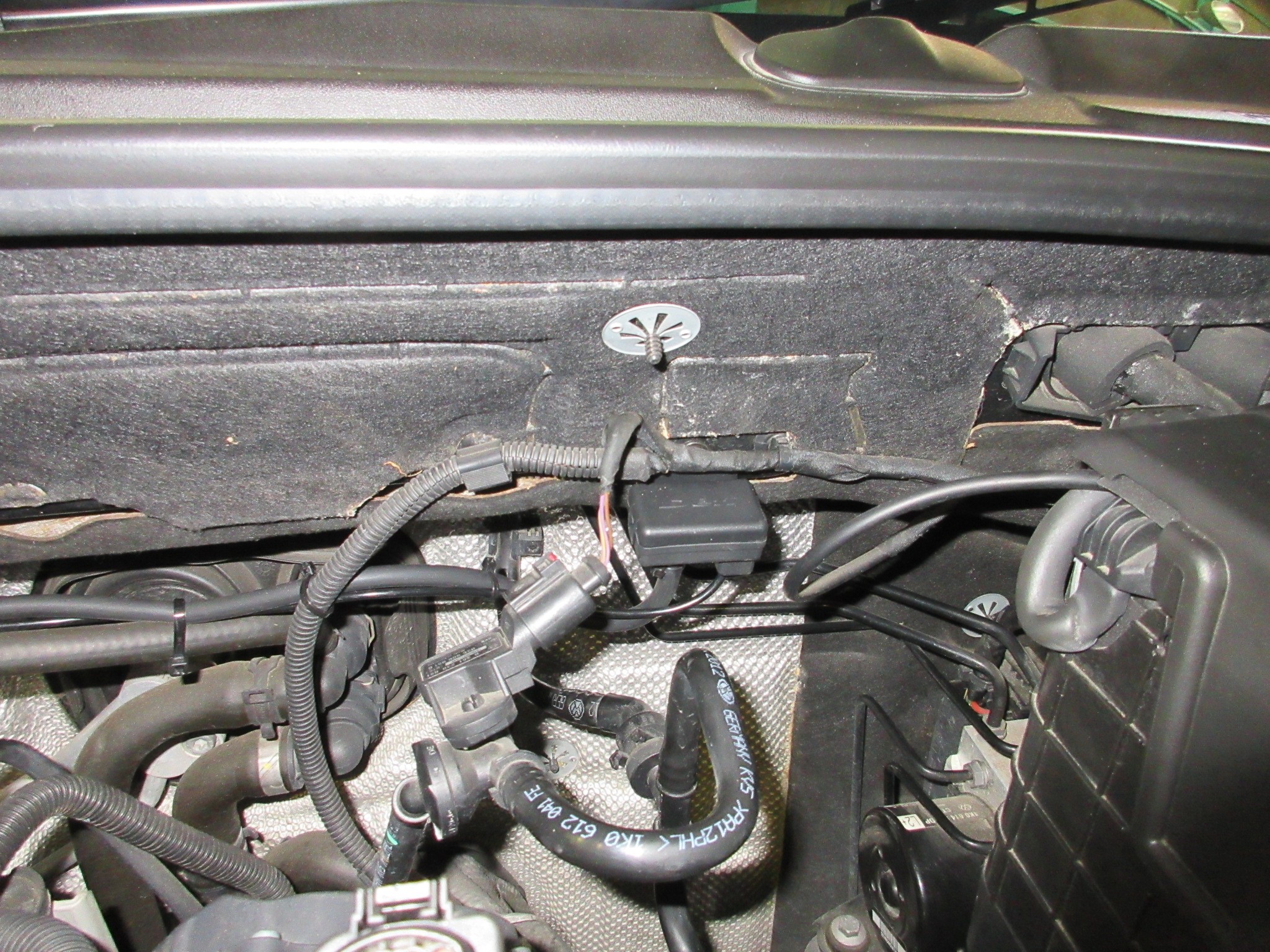 次にブレーキブースター横のカバーに風穴を開け、室内に配線を引き込みます。