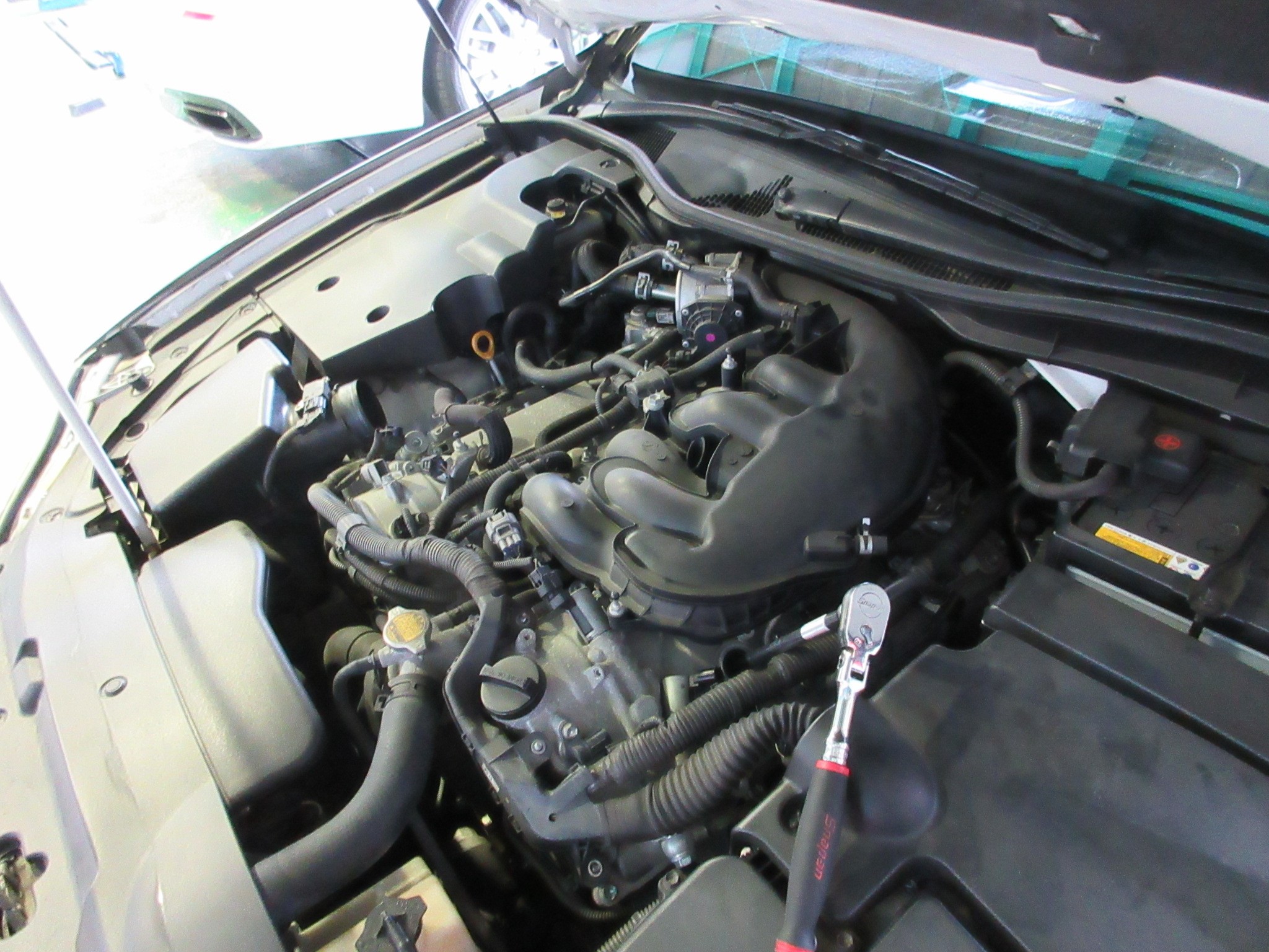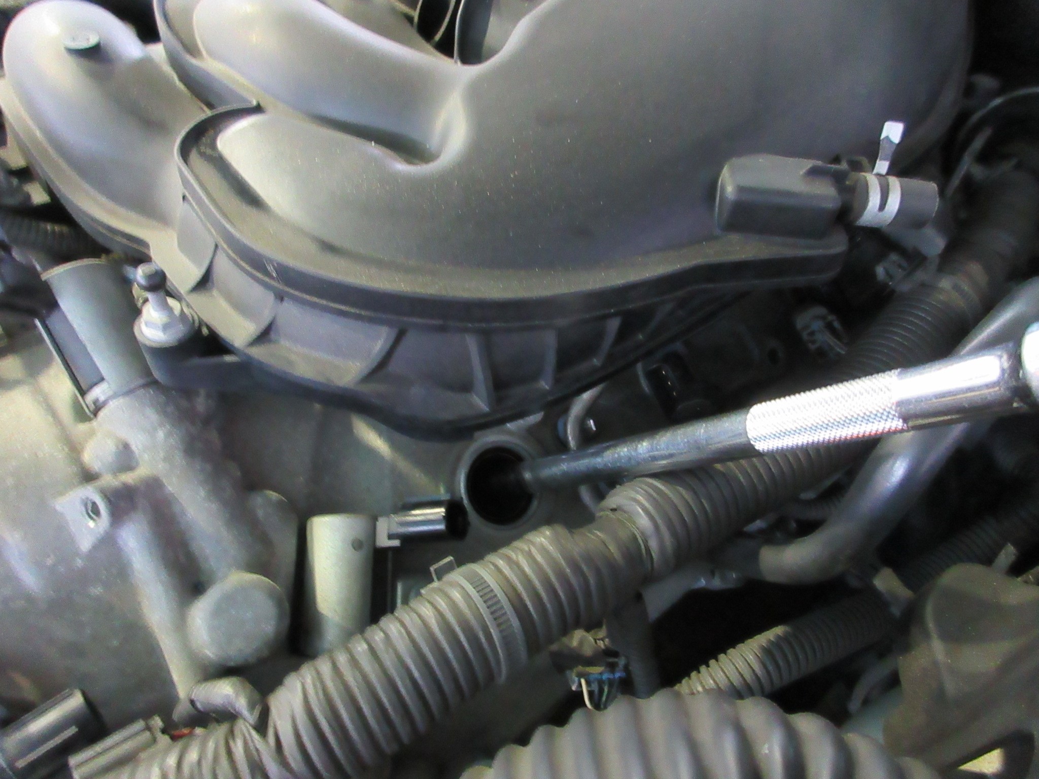 エンジンメインハーネス等、イグニッションコイルを外すのに邪魔な物を除けたり外したりしながら、プラグホールにアクセスします。