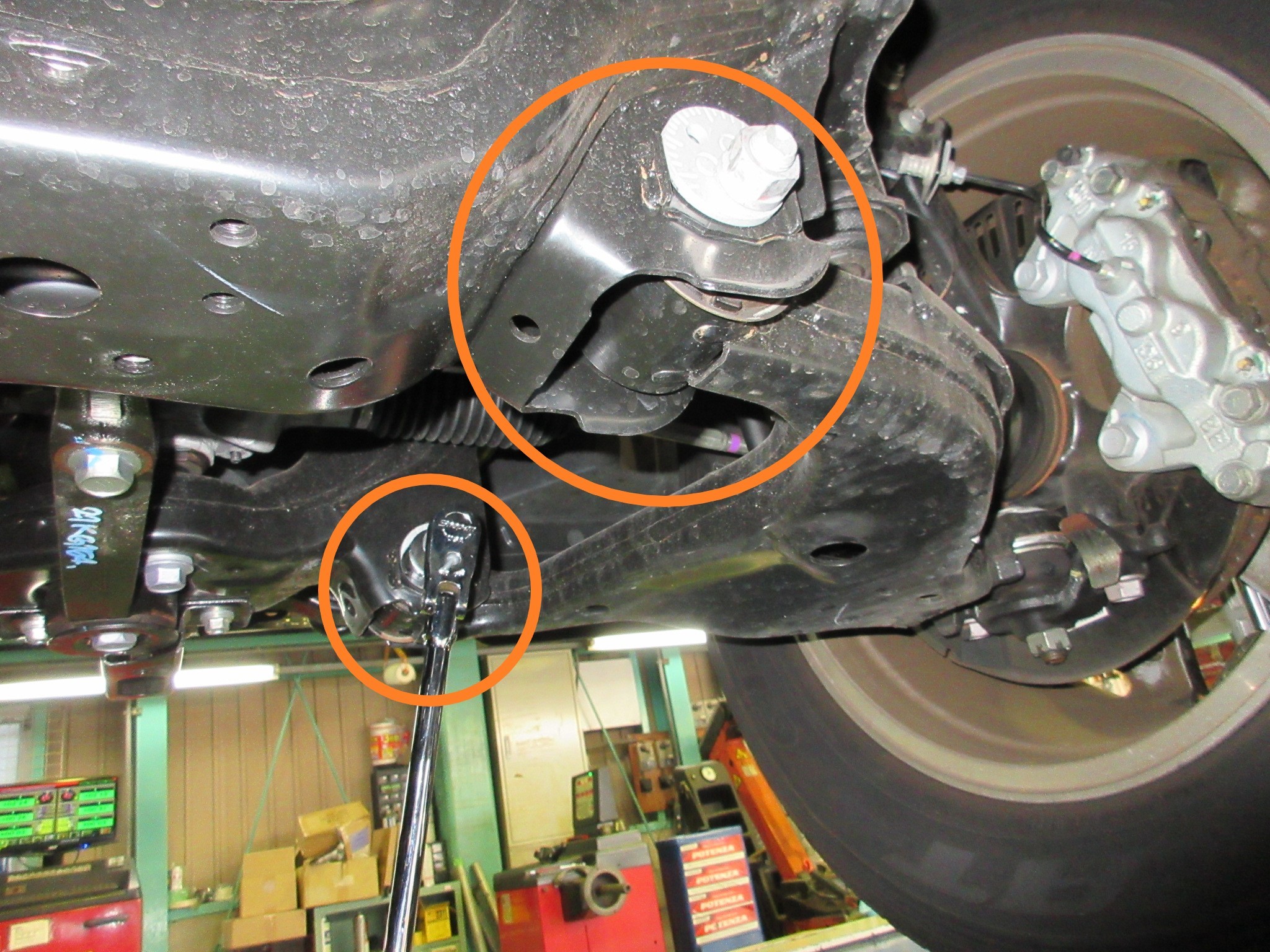 ロワアームの車体フレーム側前後の偏心ボルトを回すことで、キャンバーとキャスター角を熟練の技術で調整します。
