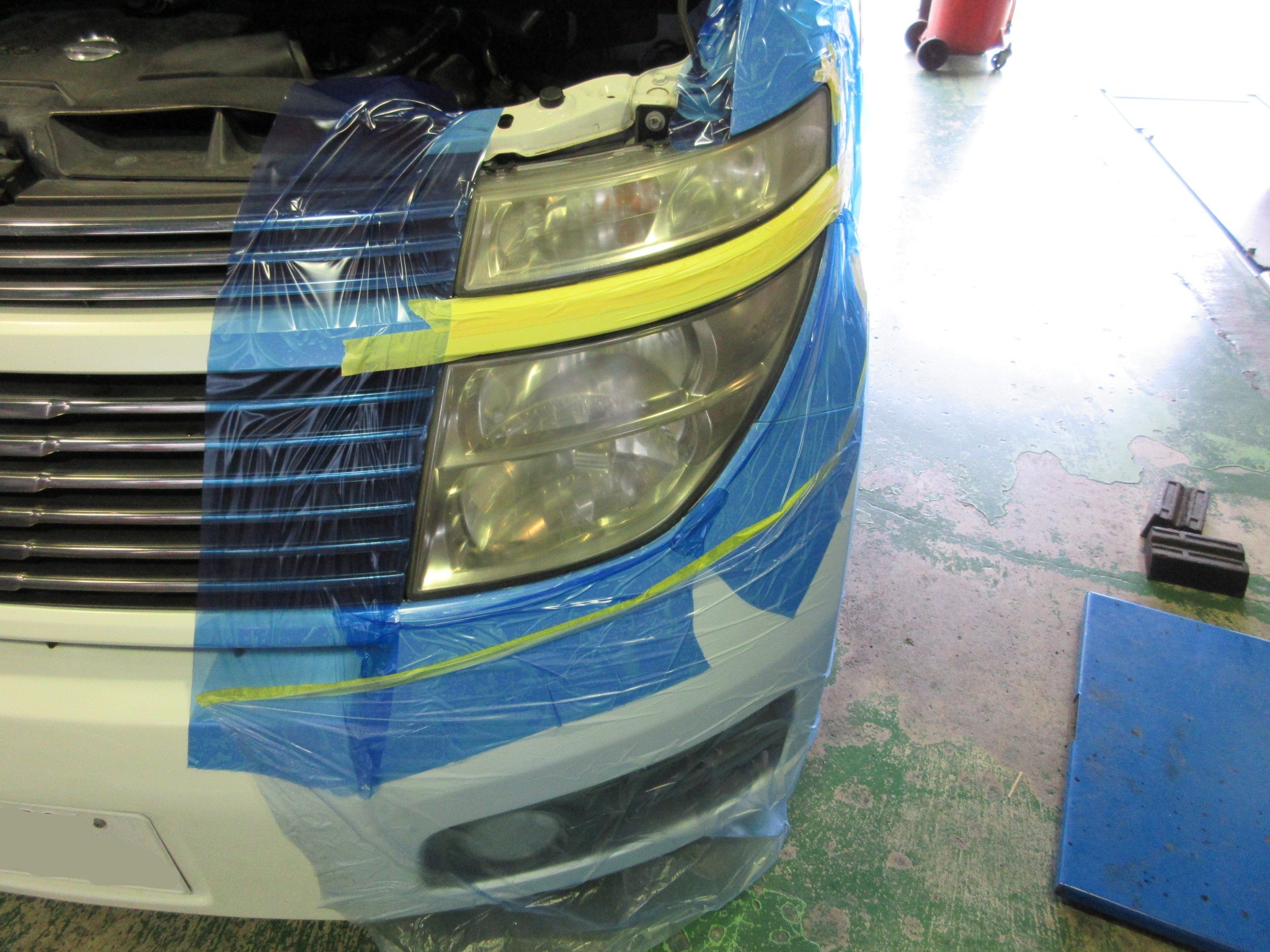 磨いたり塗り込んだりを繰り返すので、しっかり養生して作業にあたります。