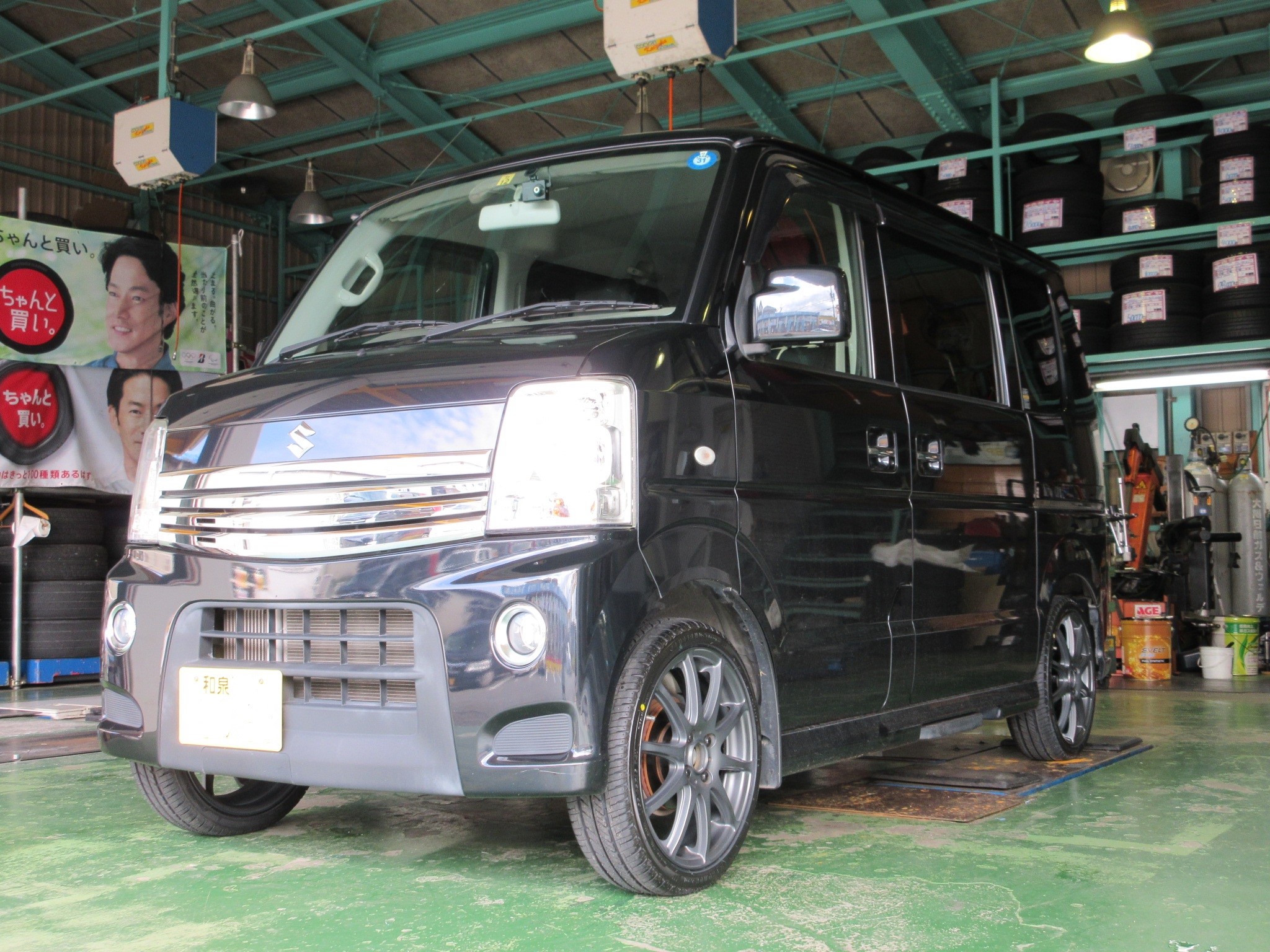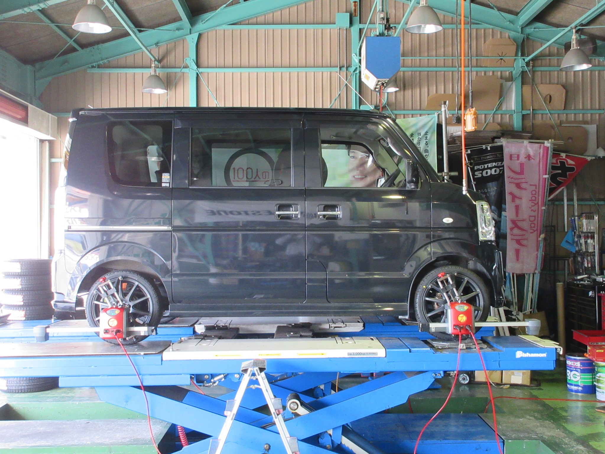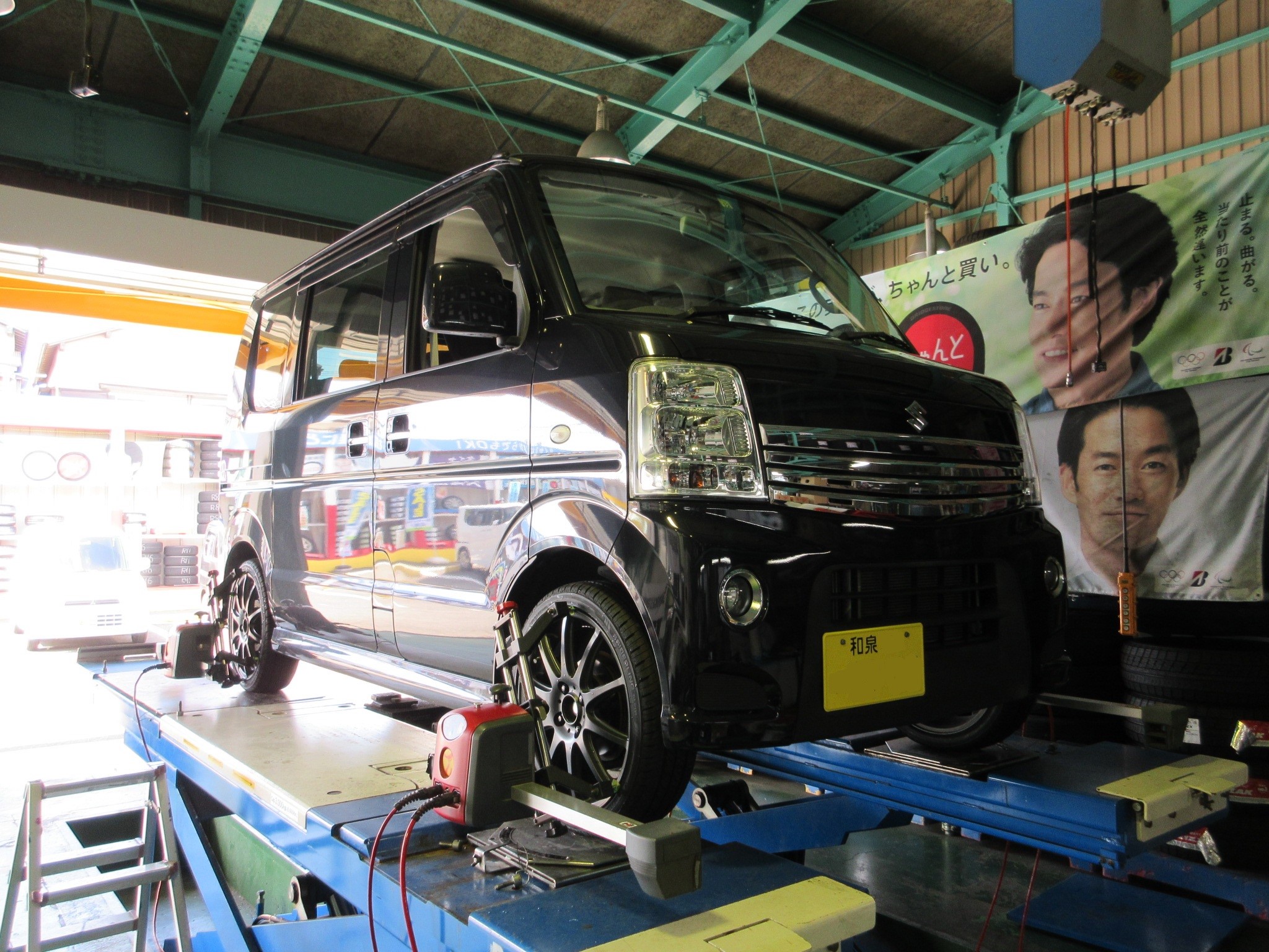 エブリイワゴンのタイヤ交換及びアライメント調整作業です。