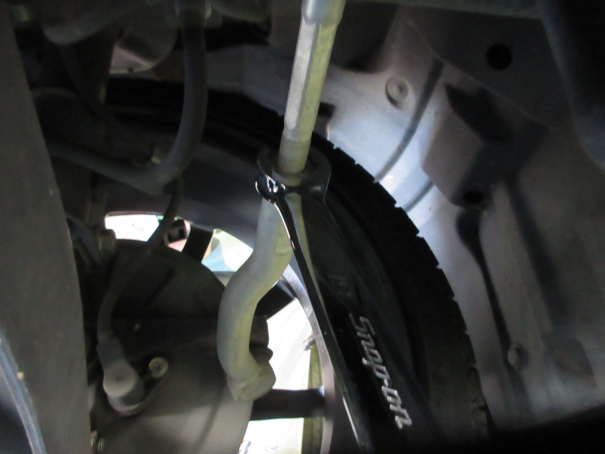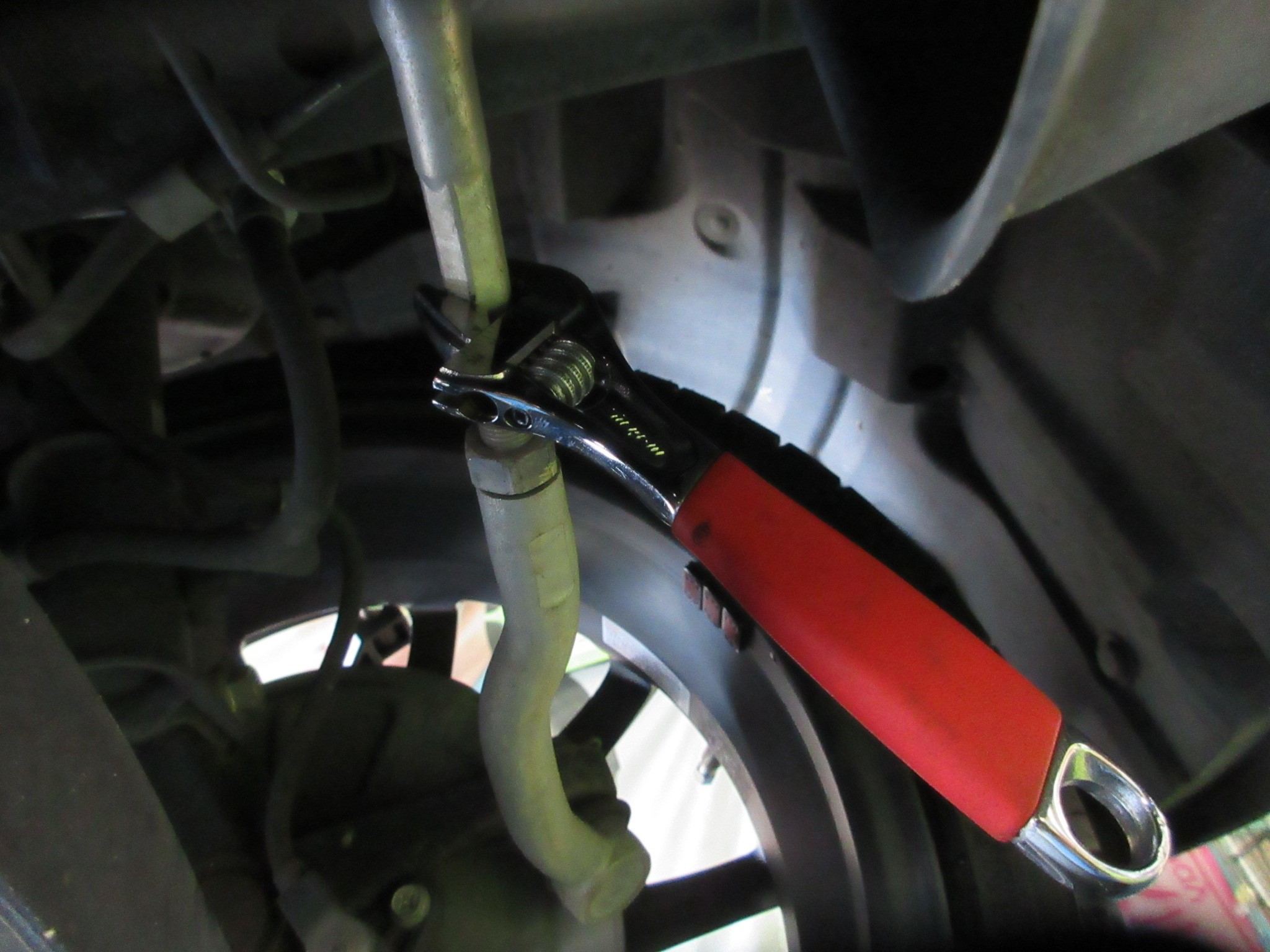 タイロッドの調整なのですが、ロックナットがなかなか緩まず、工具が滑りそうなのでフレアナットレンチの出番です。