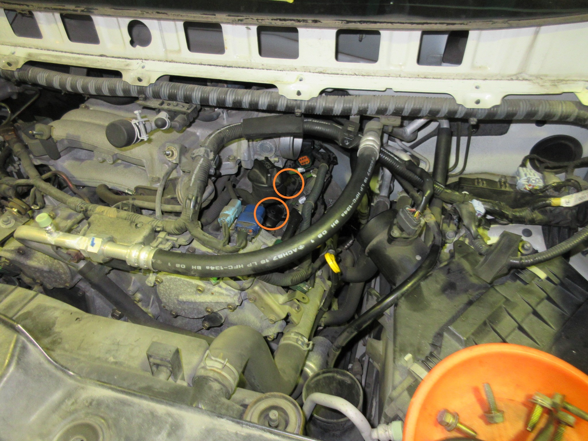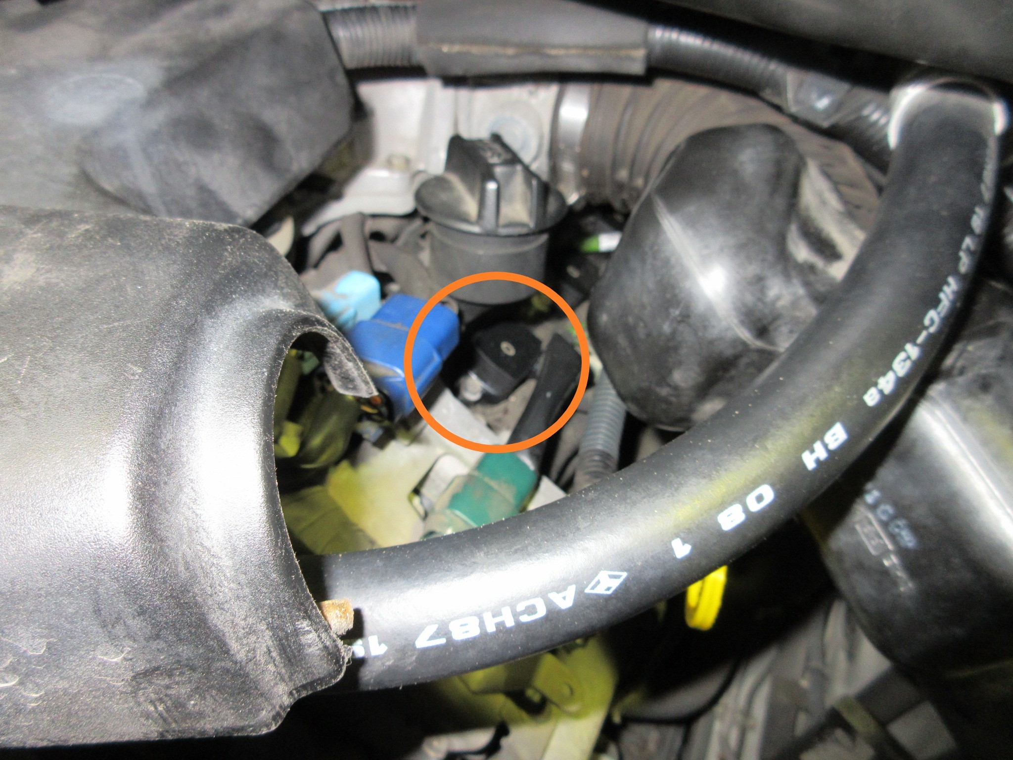 覗き込むと、助手席側のこの丸印に2番シリンダーのコイルに手が入るのを発見したので、まずはこちらを外して点検します。