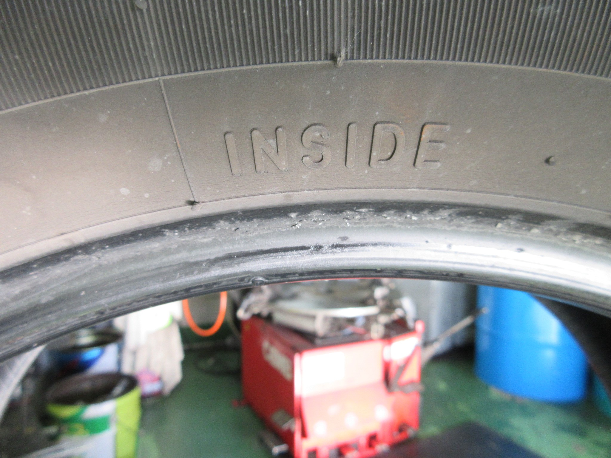 ワイヤーが露出寸前の箇所のタイヤ内側を覗くと、空気圧不足で負荷が掛かってた様で、クッキリと痕が残ってます。