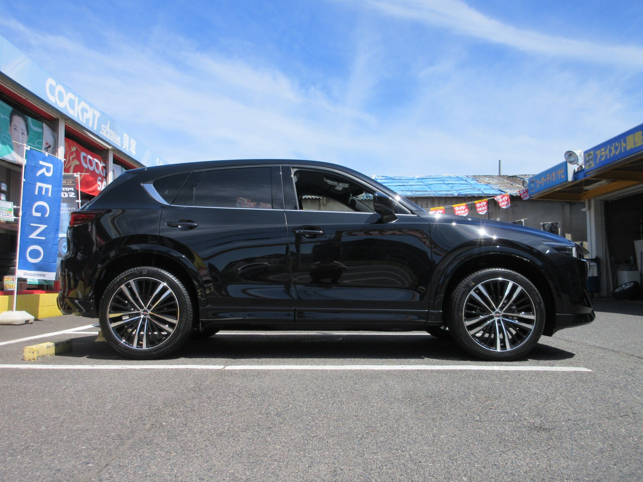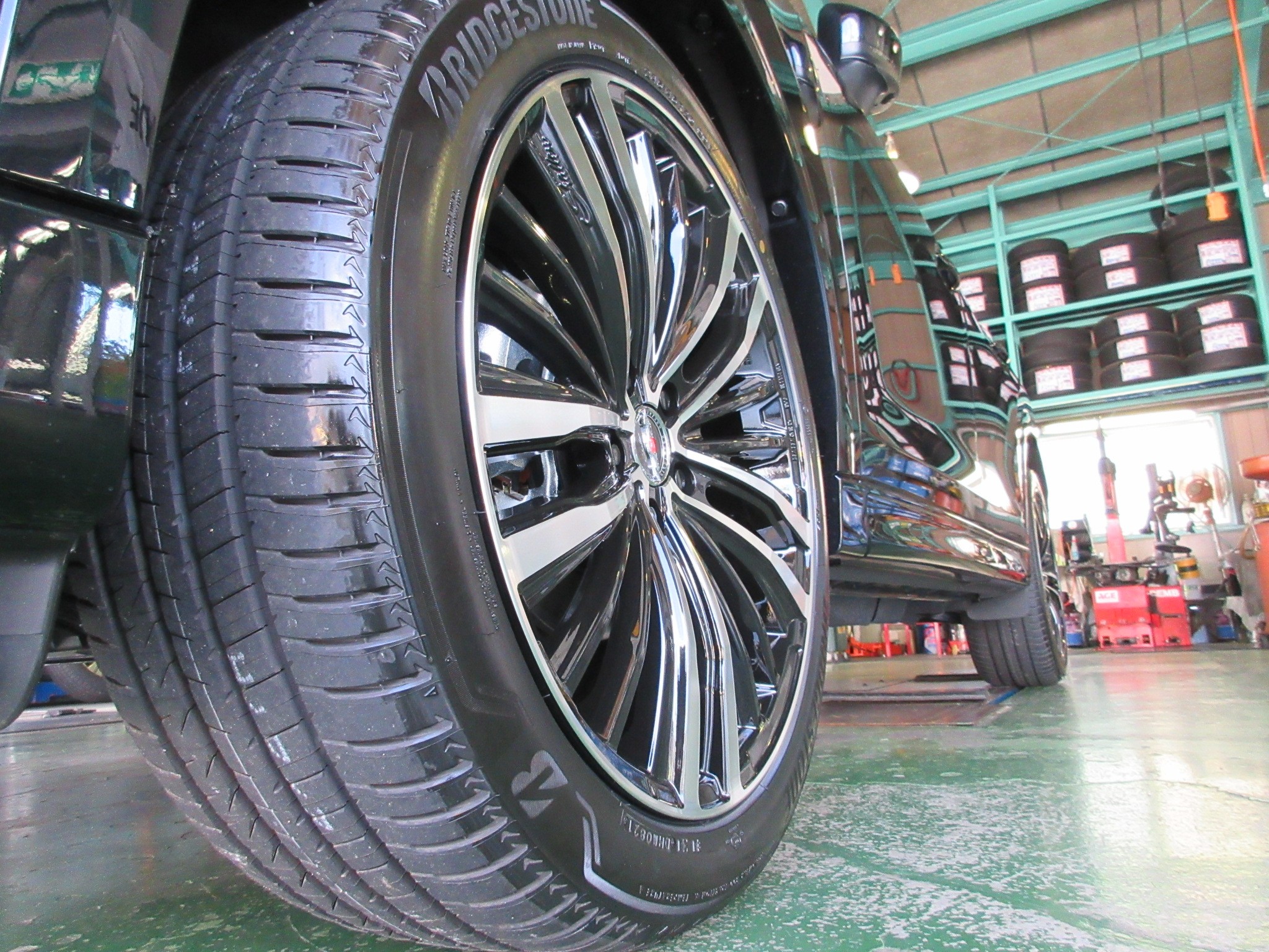 選んだホイールが黒いボディとよくマッチし、ポリッシュ部は窓枠のメッキやグリルのメッキ等との相性が良く、ホイール交換のみにしては非常に良く纏まったと思います。