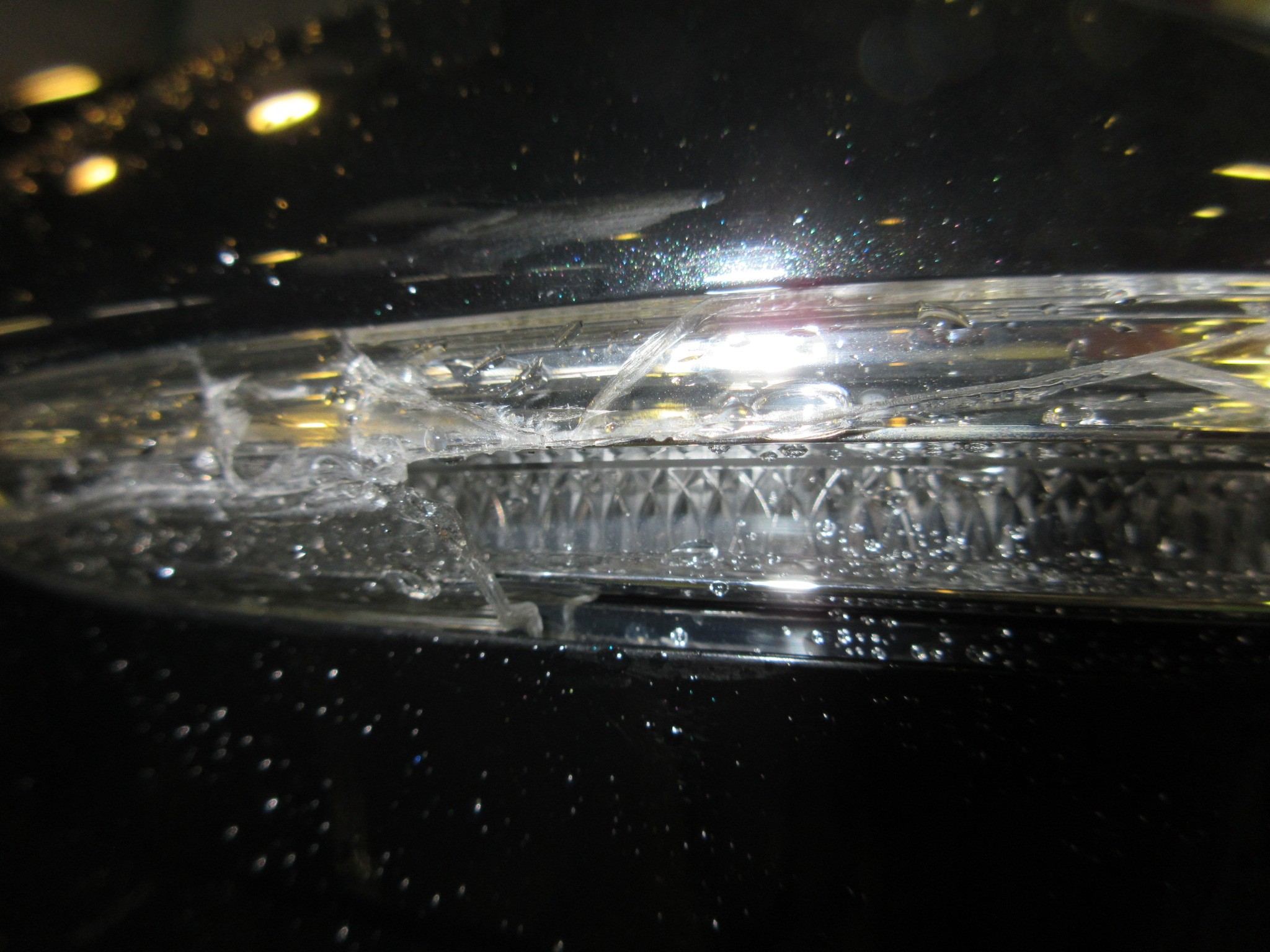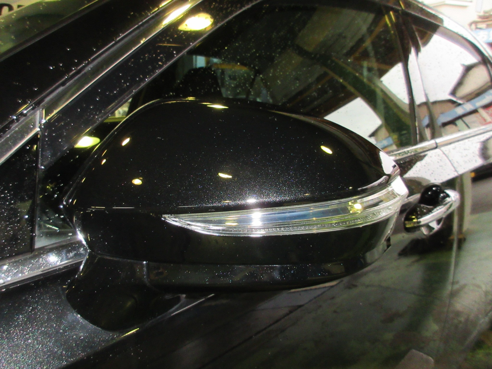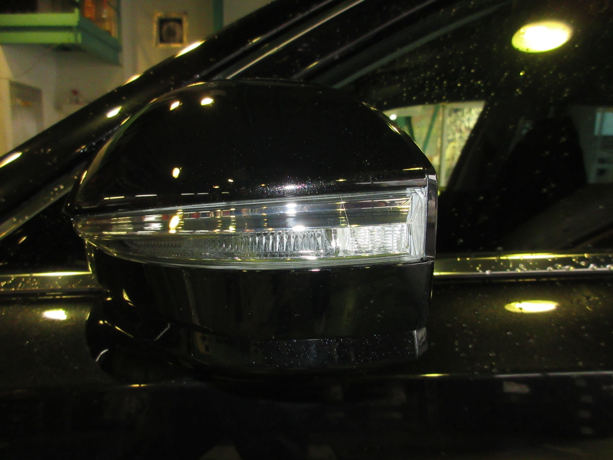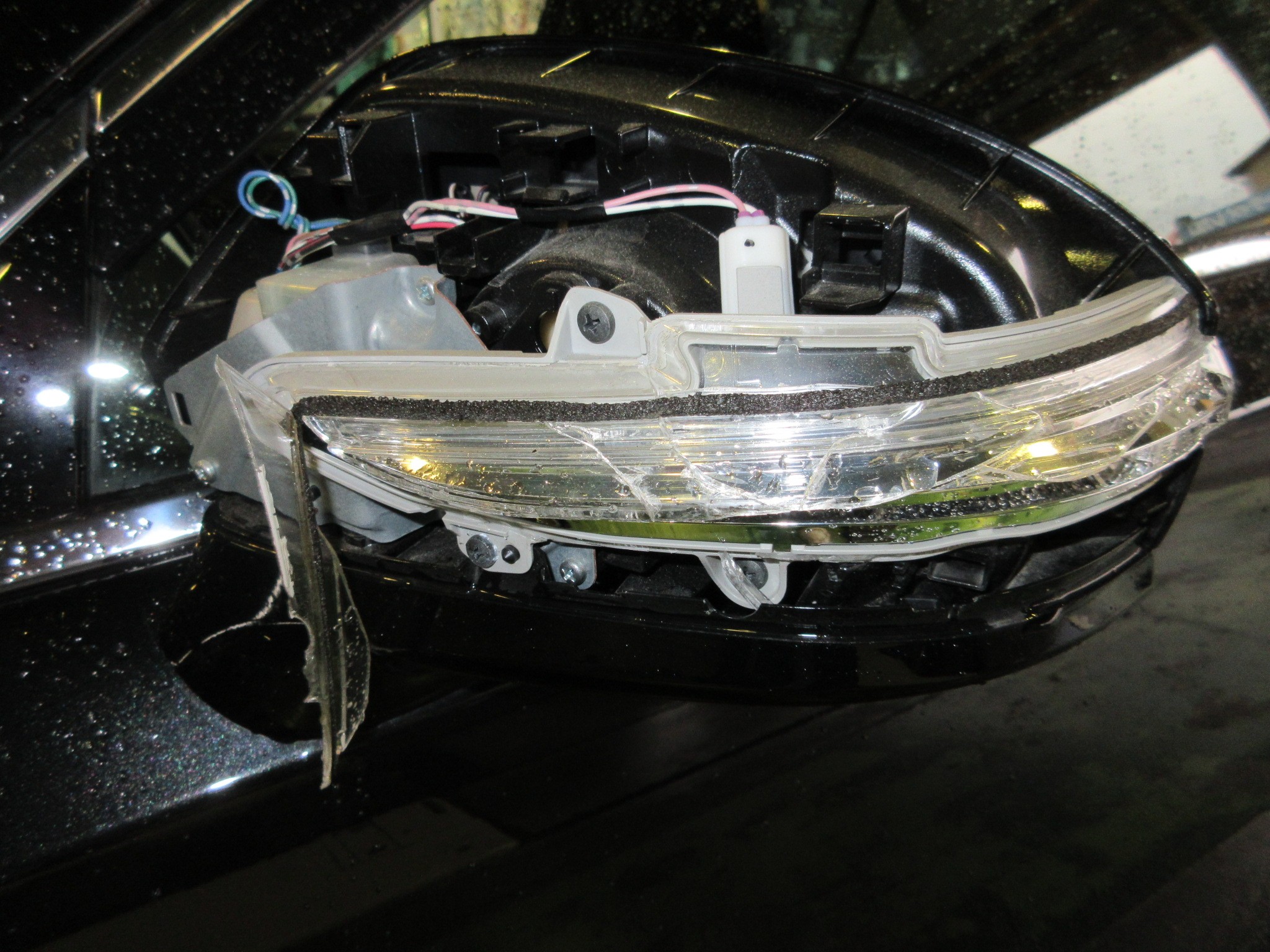 走行中に誤って左ドアミラーをぶつけてしまったみたいで、LEDウィンカーレンズがバッキバキに割れています。(雨で分かり辛いですね)