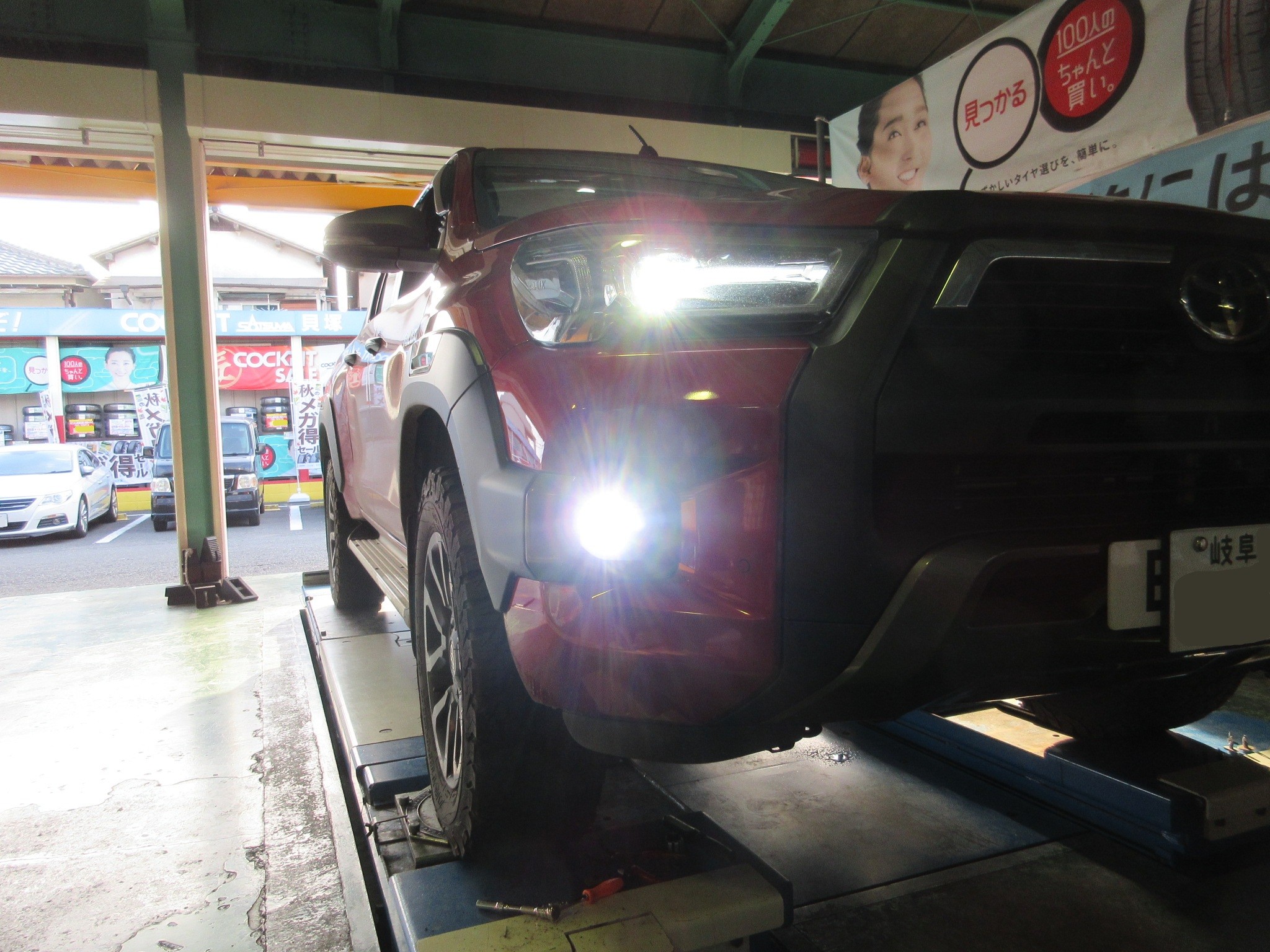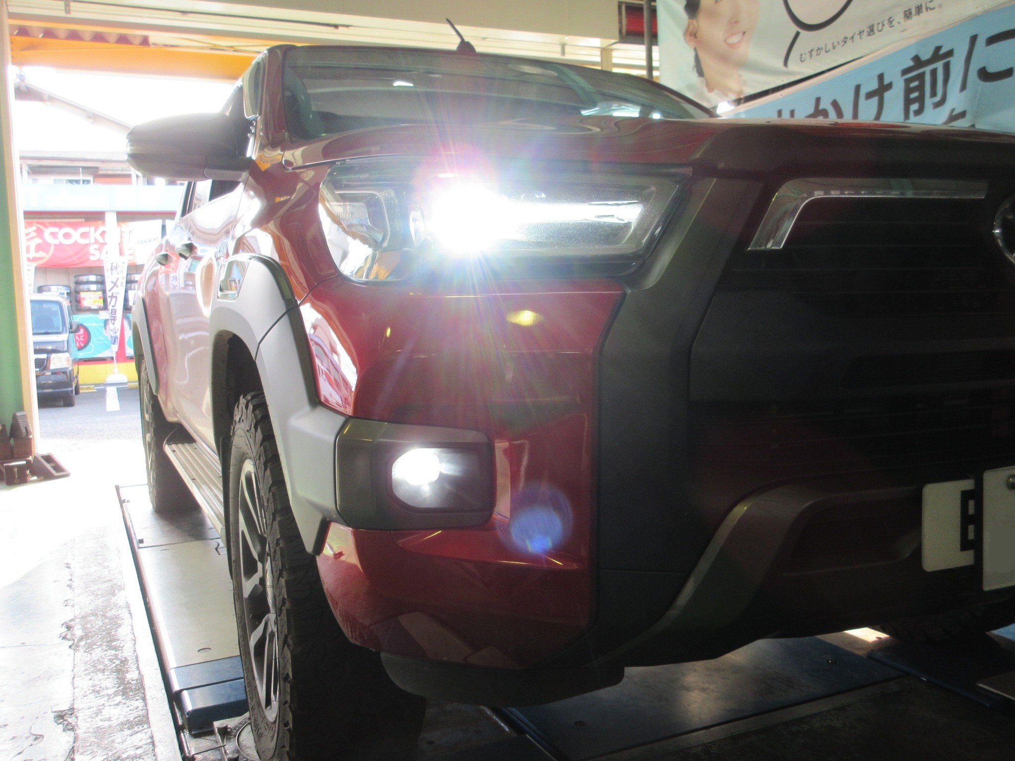 遠方(岐阜県)から御来店頂いたハイラックス(GUN125)のフォグランプ交換作業です。