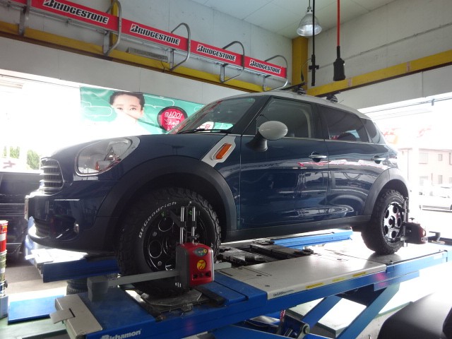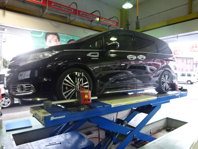 リフトアップ作業を行って、タイヤ・ホイールも変更されていますので、アライメントのご依頼です。