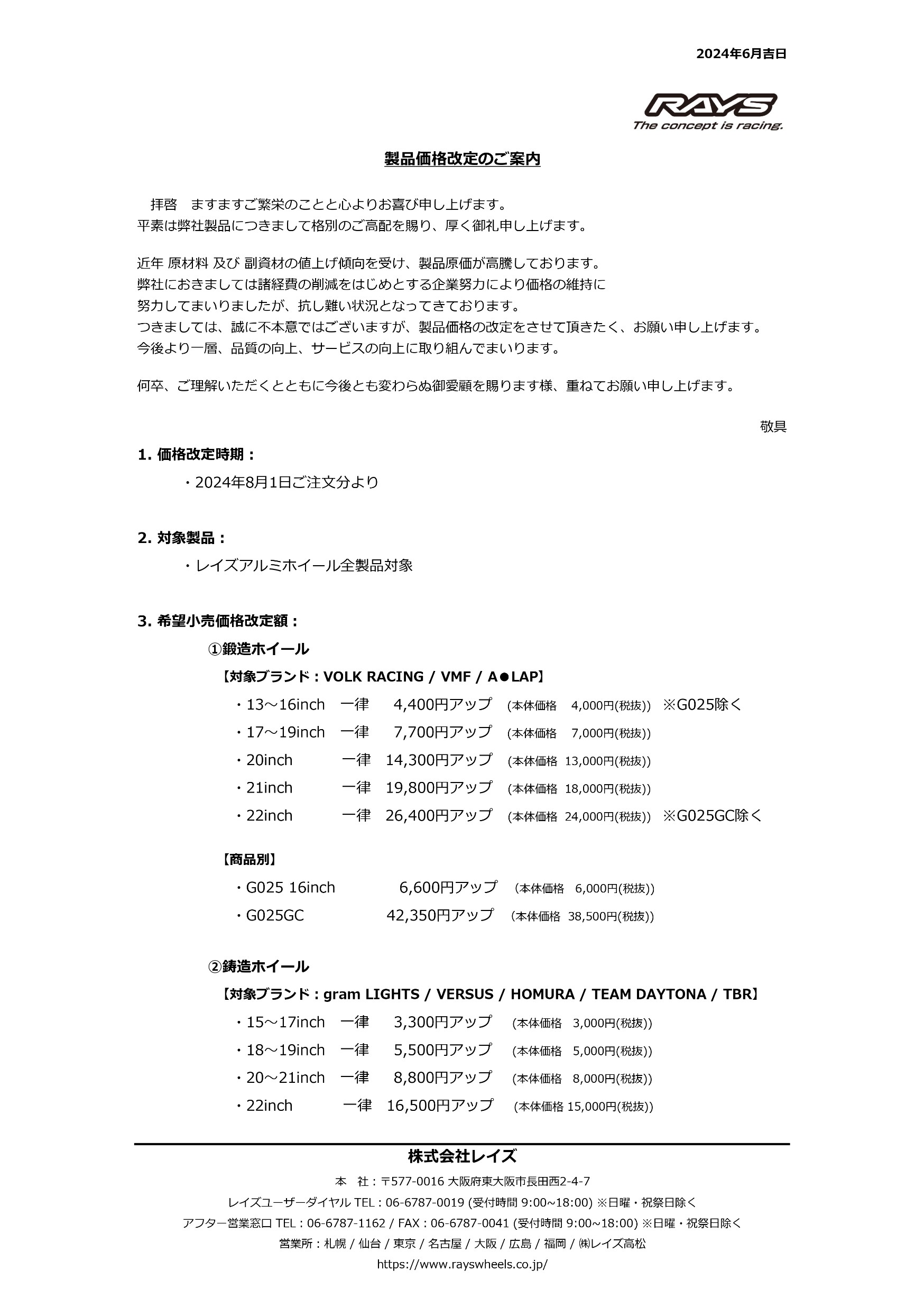 値上げは2024年8月1日注文分より、RAYS製アルミホイール全製品対象で、1本あたり3,300円~42,350円と幅広い値上げとなります。