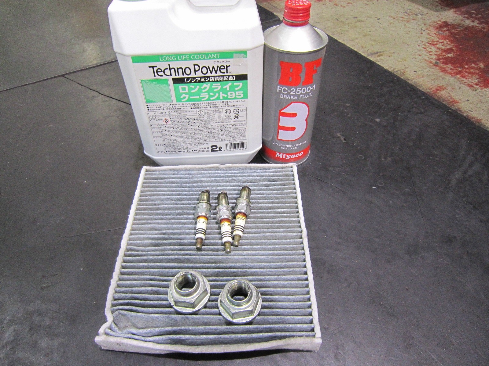 交換部品です。(LLC、ブレーキフルード、スパークプラグ、リヤハブロックナット)