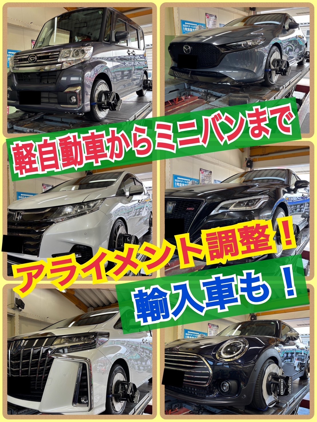 ドレスアップした車だけでは無く、軽自動車から輸入車までタイヤの長持ちの為に、欠かせないのがアライメントです!
