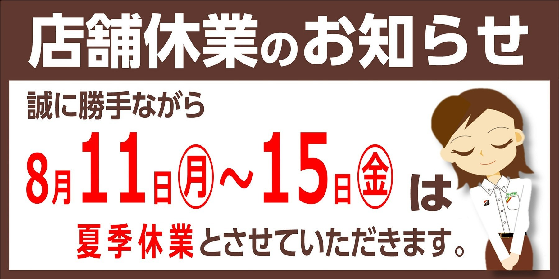 2025年8月10日 ツイート ご迷惑をお掛け致しますが、何卒よろしくお願い致します。 8月16日(土)は通常営業となります。 夏季休業中は、WEBからのタイヤ購入をご利用下さい。 ブリヂストン タイヤオンラインストア Prev Next