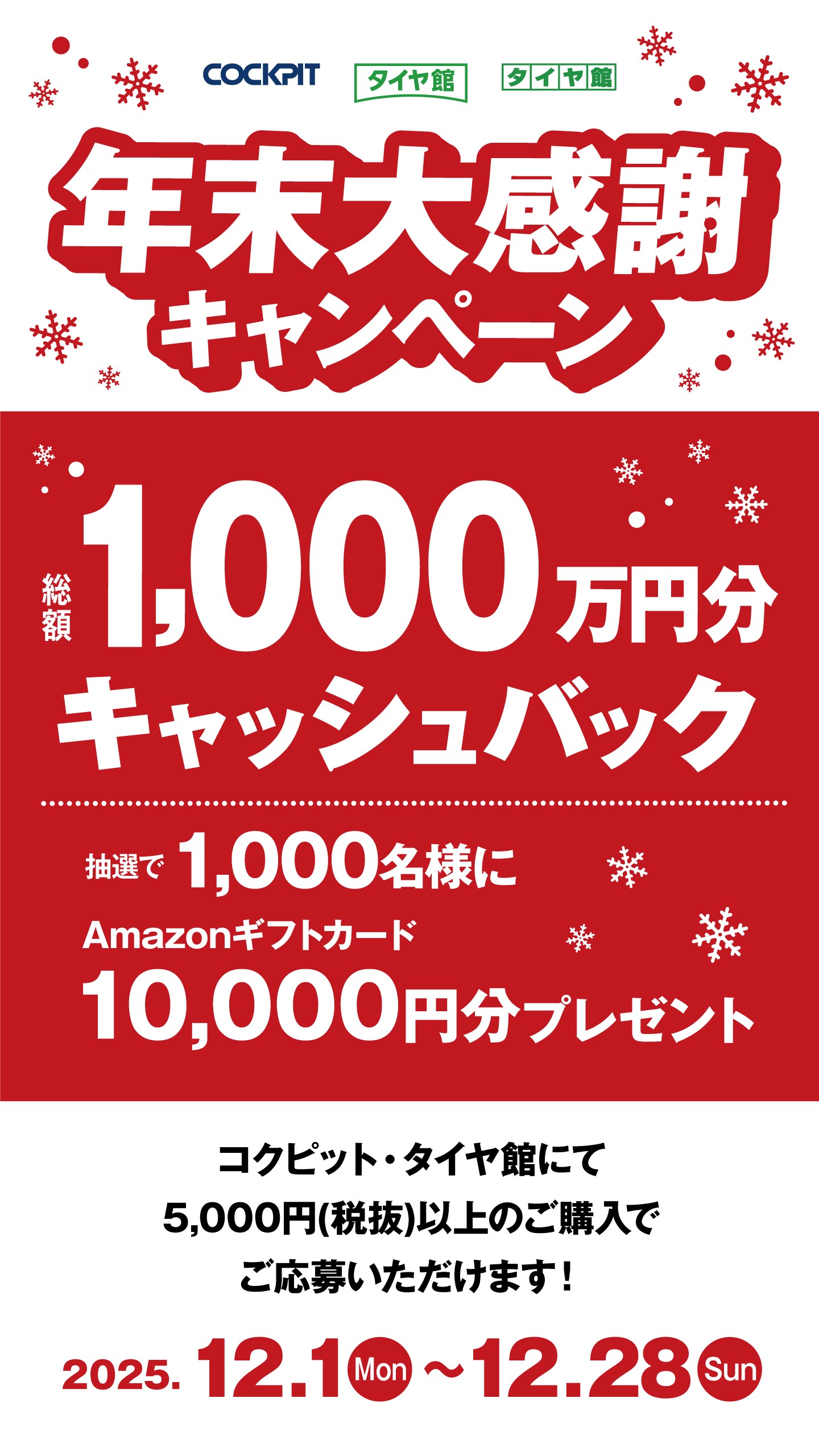 2025年12月11日 ツイート いつも当店をご利用いただきありがとうございます。 12/1(月)~12/28(日)まで コクピット・タイヤ館 年末大感謝キャンペーン実施中です! 期間中税抜5,000円以上ご購入でアマゾンギフトカード10,000円分が当たるチャンス! ご購入時のレシートの写真を撮って応募するだけ! キャンペーン内容はコチラ 応募はコチラから 決算セールでお得に購入&キャンペーンでさらにお得になるチャンス! ぜひこの機会にご利用ください! Prev Next