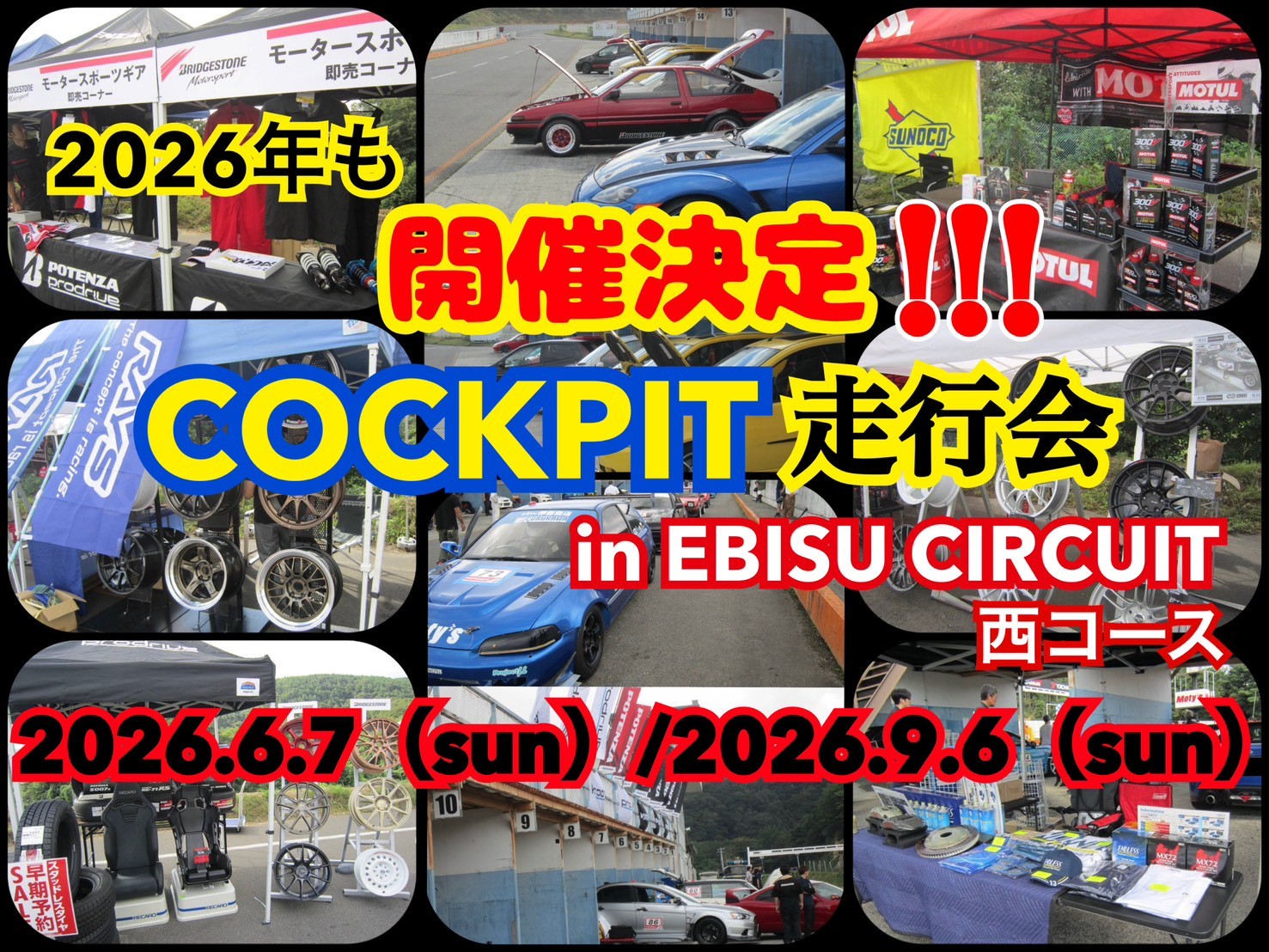 2026年2月3日 ツイート 2026年の走行会の日程が決定しました! ① 6/7(日曜日) ②9/6(日曜日) 料金 ●グリップクラス 15,000円 予定 ●ドリフトクラス 9,000円 予定 ●体験走行 4,000円 予定 ※受付開始は再度告知させて頂きます。 #エビスサ−キット #走行会 #POTENZA Prev Next