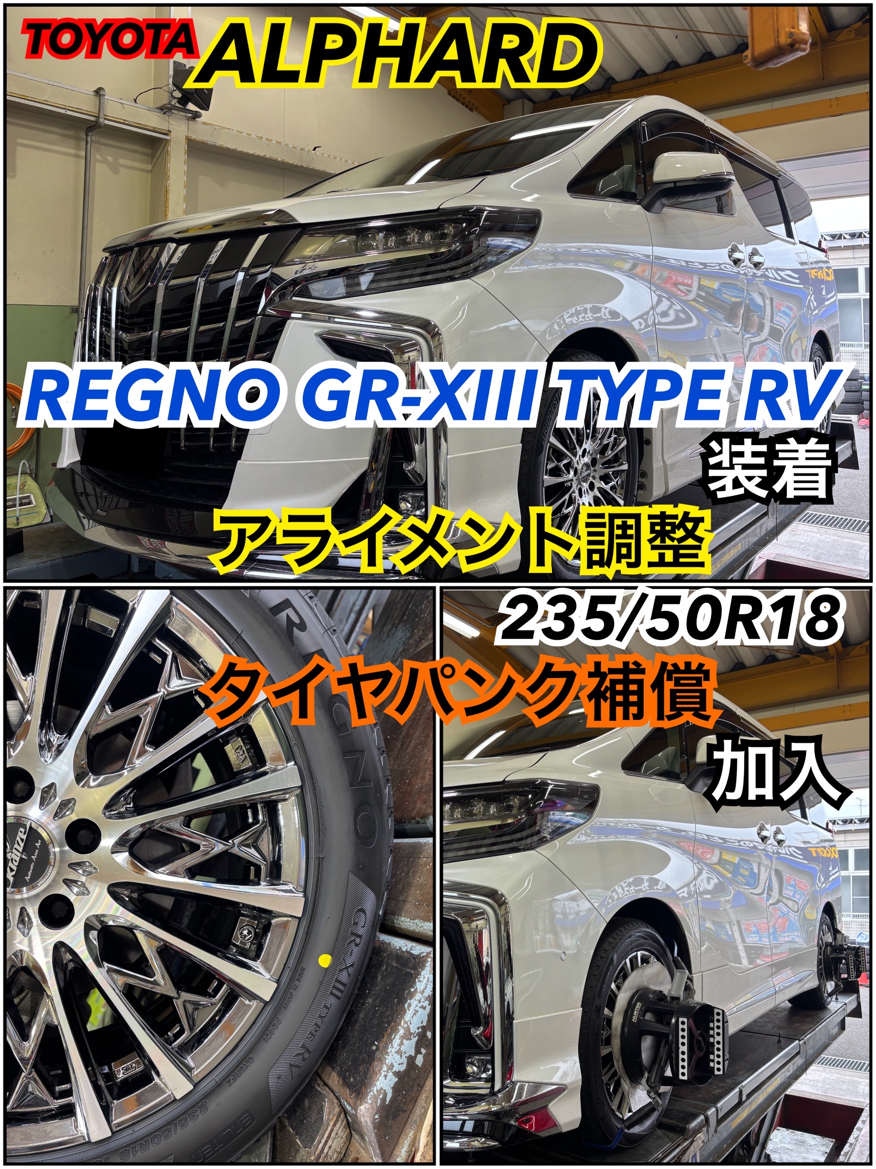 #トヨタ#アルファード#AGH30W#タイヤ交換#脱着#点検#タイヤ#夏タイヤ#ノーマルタイヤ#新品タイヤ#REGNO#レグノ#GR-XⅢ#アライメント#アライメント調整#4輪ホイールアライメント#パンク補償#タイヤ補償#福島市#コクピット西部