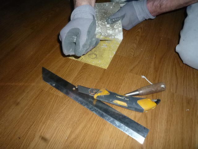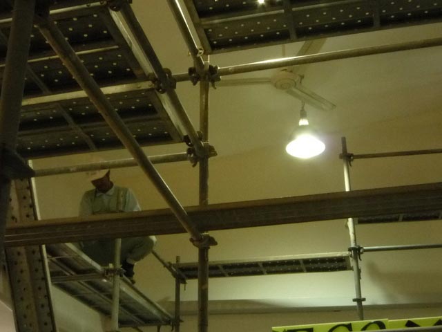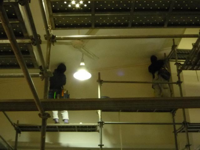 ボード、クロスのヒビ、床の修理、天井の器具の固定と順調に進んで