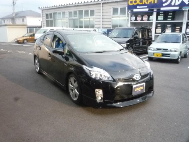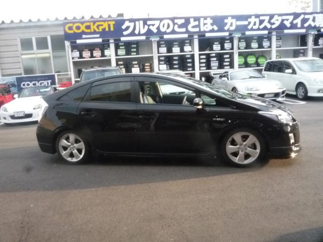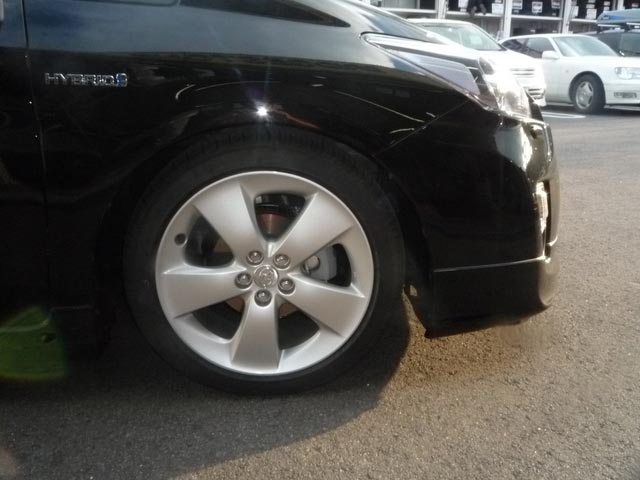 車高自体は、メーカー標準の車高より更に下げて、画像で判りますかね? あ まり鮮明では無くてゴメンナサイ。結構下がってるでしょ! プリウスもこうなるとカッコイイですよね。