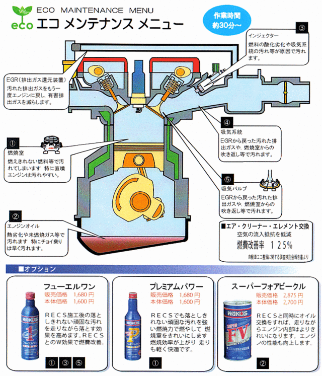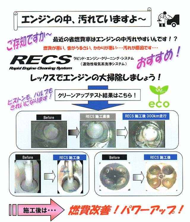 皆さんもうご存知ですよね!〔RECS〕。和光ケミカルで薦めている、吸気系洗浄システムです。