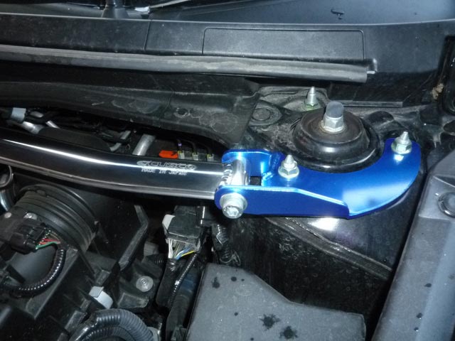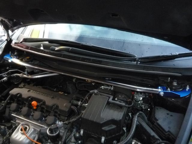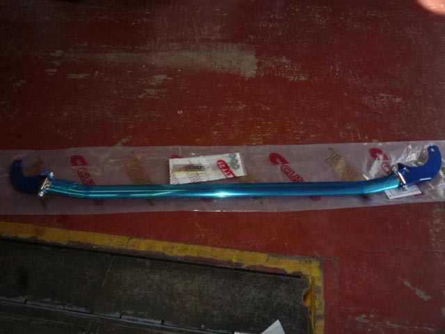 ②フロントタワーバー取付・・・最近の車は剛性がいまひとつというのは、皆さん知ってますよね。そこで、〔クスコ〕のオーバルシャフトタイプをチョイス(これしか有りませんでした)。これで、ステアリングの応答性も向上するかな?
