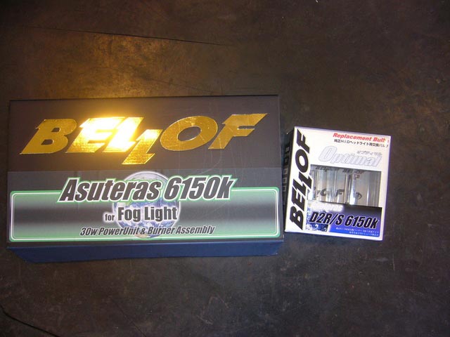 まず、ライト関係ですが〔ベロフ〕の製品で統一。ヘッドライトは純正交換タイプの6150K、フォグランプも専用の〔Asuteras6150k〕で色を合わせました。若干の色の違いは出てしまったんですが、純正の色に比べたらOKという事で、了承してもらいました。ヨカッタ!