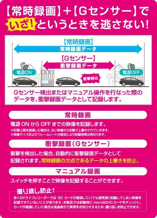もし、万が一の事故にあってしまった時に、人の記憶なんて曖昧です。そんな時にドラレコが付いていて、記録が残っていれば・・・。紛れもない証拠が残ります。