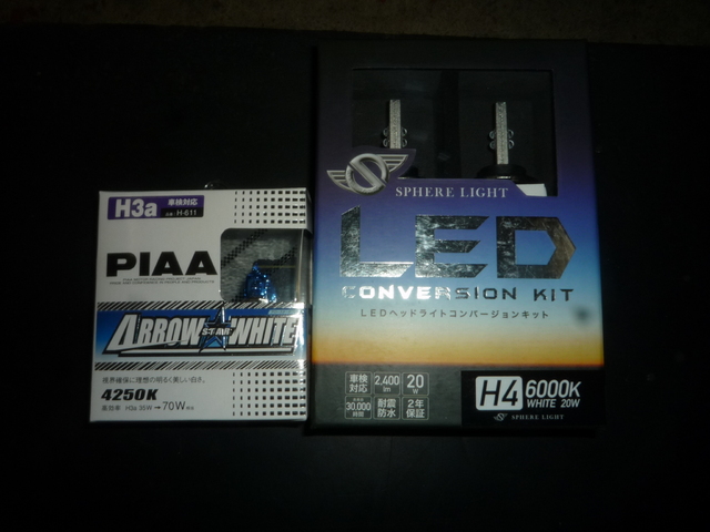 ヘッドライトは最近増えてきたLEDヘッドライト。〔スフィアライト〕のH4 Hi/Loキットです。フォグランプは〔PIAA〕の4750Kの〔アローホワイト〕H3aタイプ。