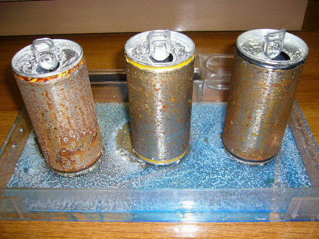 中央のコーティング済みのスチール缶はほとんど錆が発生していません。