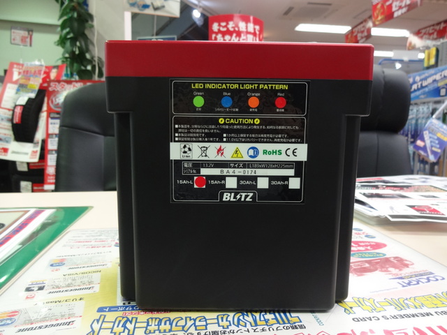 〔BLITZ〕より発売中です。本体サイズは1種類、容量が15Ahと30Ahの2種類になります。