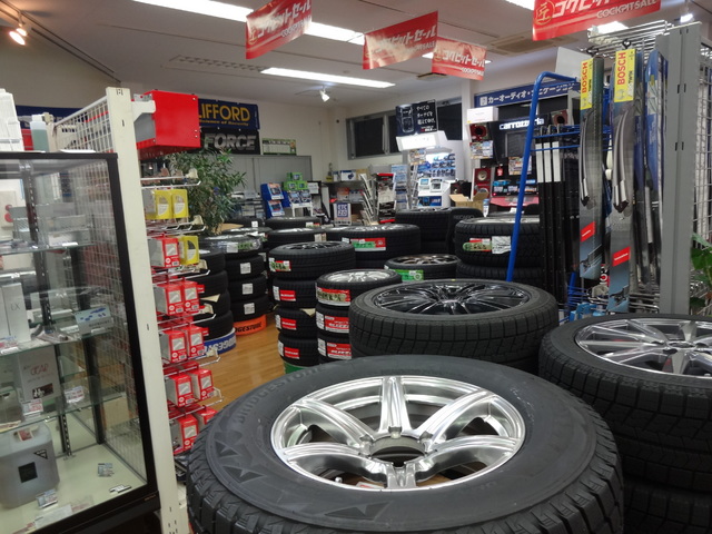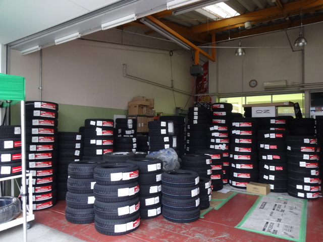 駐車場のタイヤタックも綺麗にタイヤが並べられ、店内には所狭しとセットタイヤが。。。。