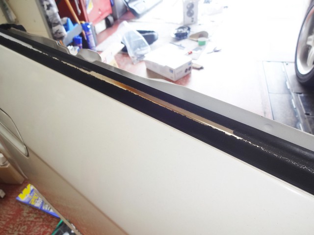 それと一緒に、ドア上部のモールの塗装が剥がれて、見た目がかなり悪かったので、そこを新品に交換。さらに、運転席側のドアのヒンジが傷んでいて、ドアが下がっていたので、ヒンジも新品にしました。