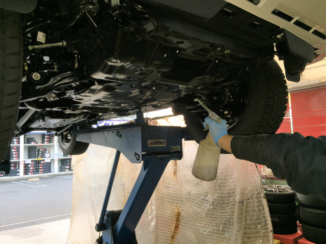 そこで〔下廻り防錆コート〕。 特殊な溶剤を車両の下回りに塗布し、サビを防止する施工です。今日も数台の施工をしました。