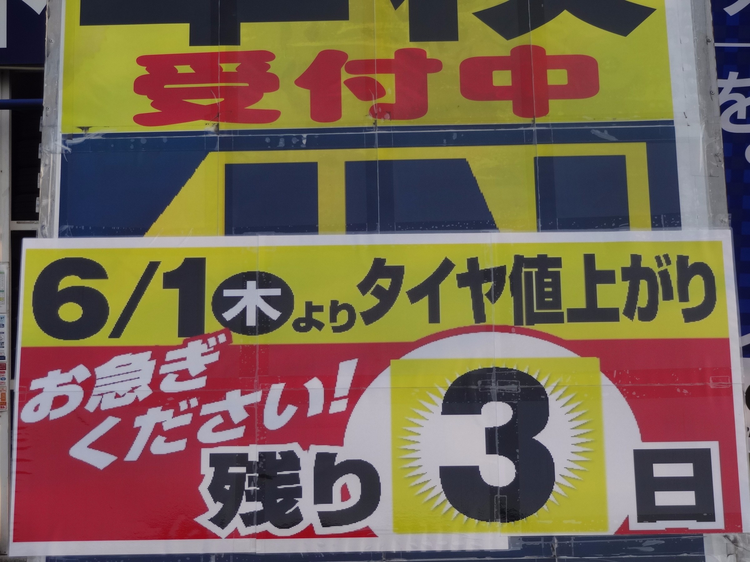2017年5月29日 ツイート 夏タイヤの値上げまで、あと2日です。 今日も駆け込み(?)で、ご注文を頂いております。 夏タイヤは大丈夫ですか? 明日は定休日ですが、営業しております。 タイヤのチェックだけでも大歓迎です♬ 是非ご来店くださいませ(^o^) Prev Next