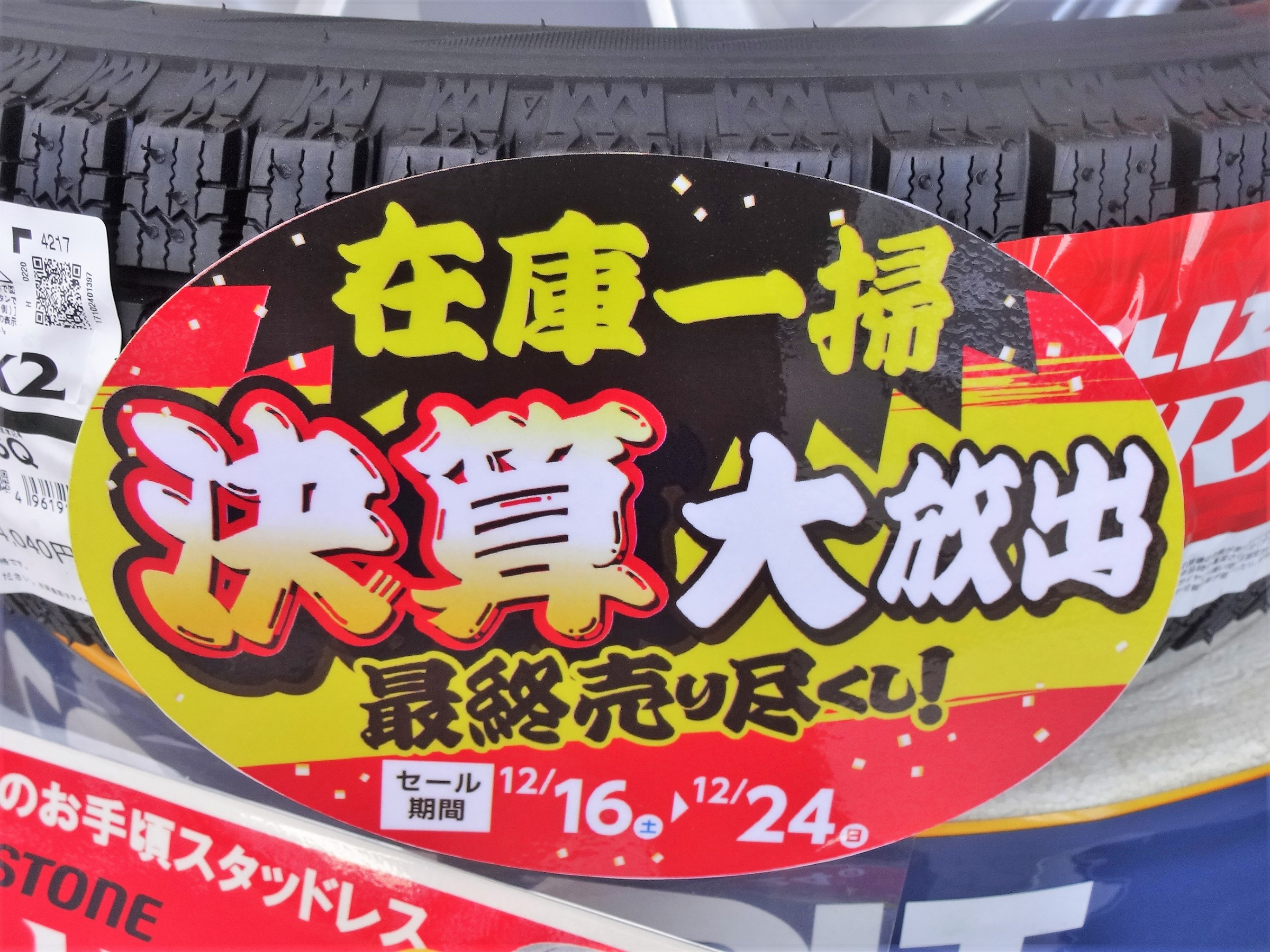只今、年末決算セールを行っています。在庫品の夏タイヤ・用品・いま旬の冬タイヤを通常よりお求めやすくご提供中。この機会を逃す事無かれ! 特に夏タイヤ! 絶対お得です。(お取り寄せ品は除く)