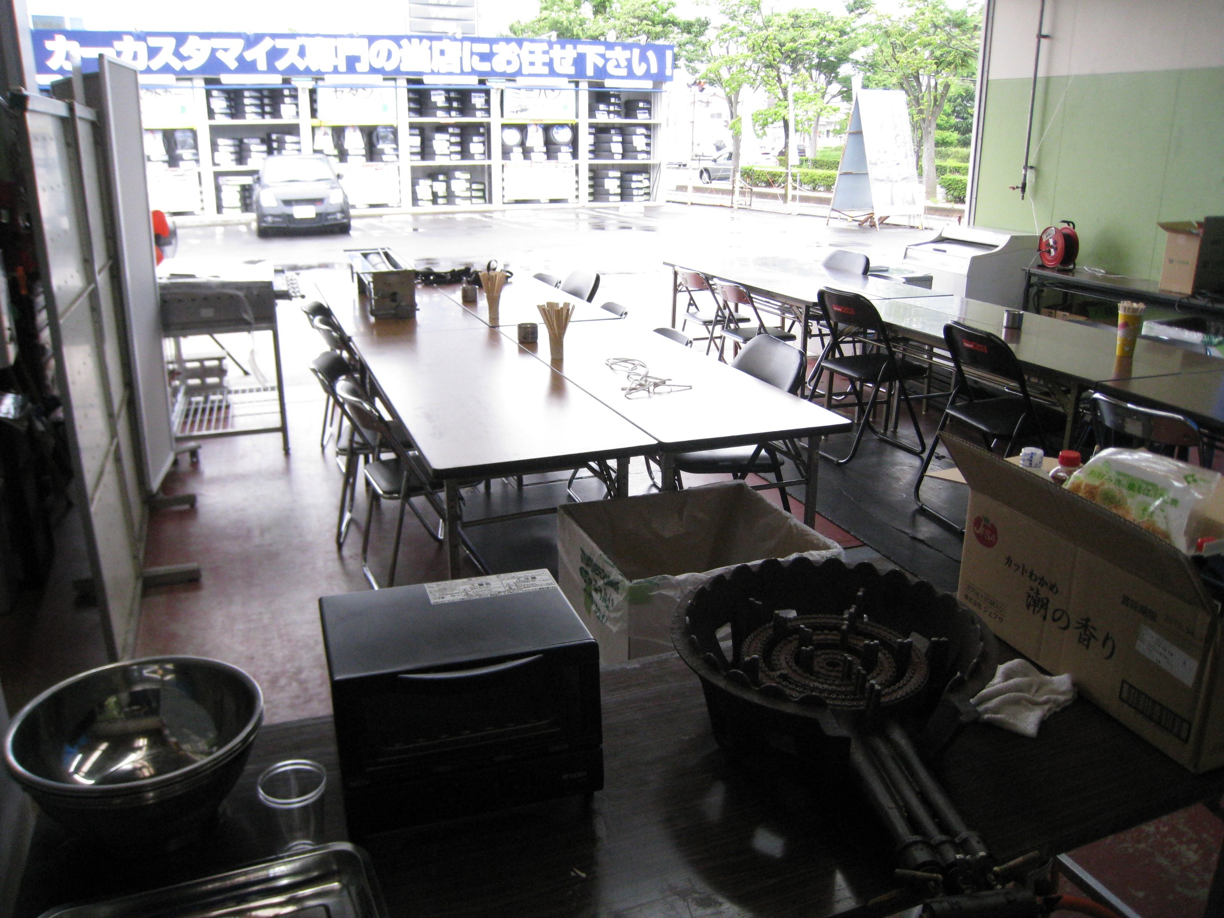 テーブルと椅子をならべました。外には大きなテントを設置します。