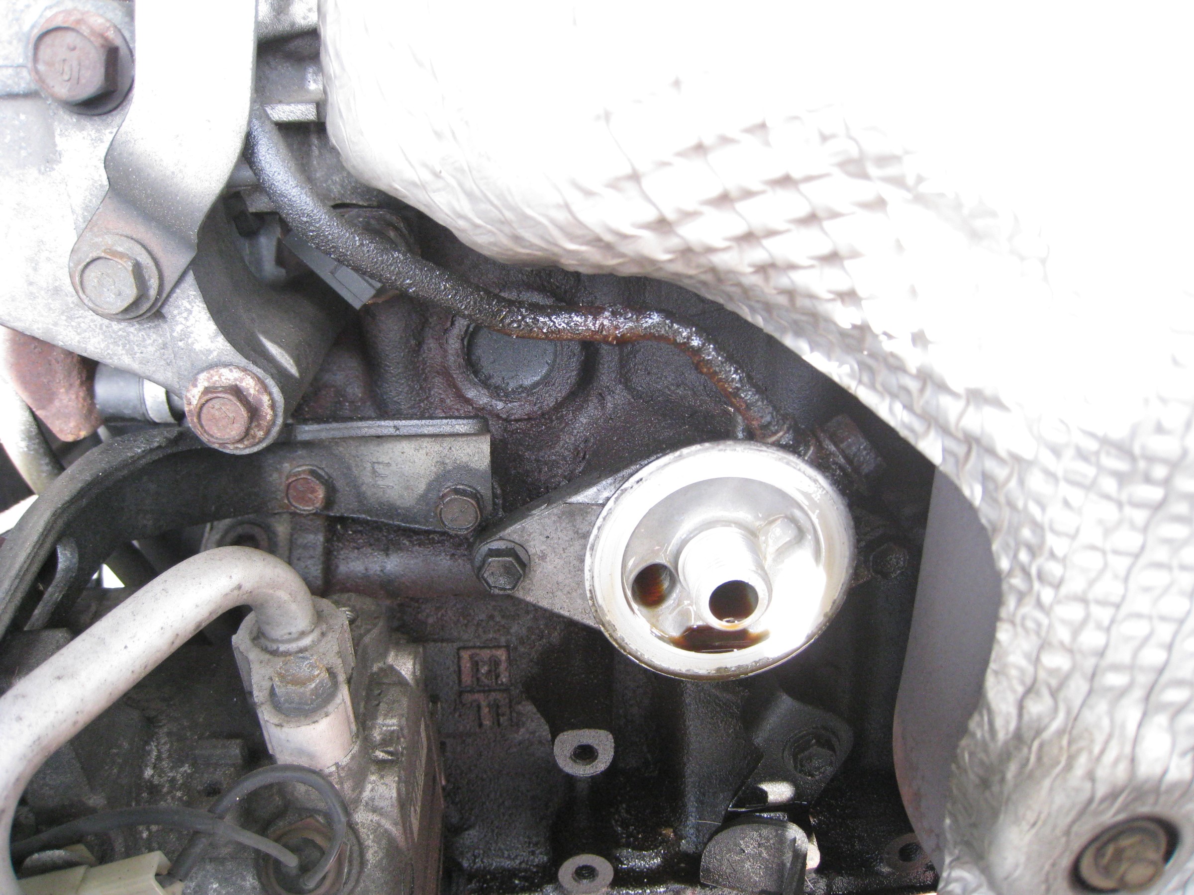 写真の中央のオイルパイプからオイルが漏れているようです。